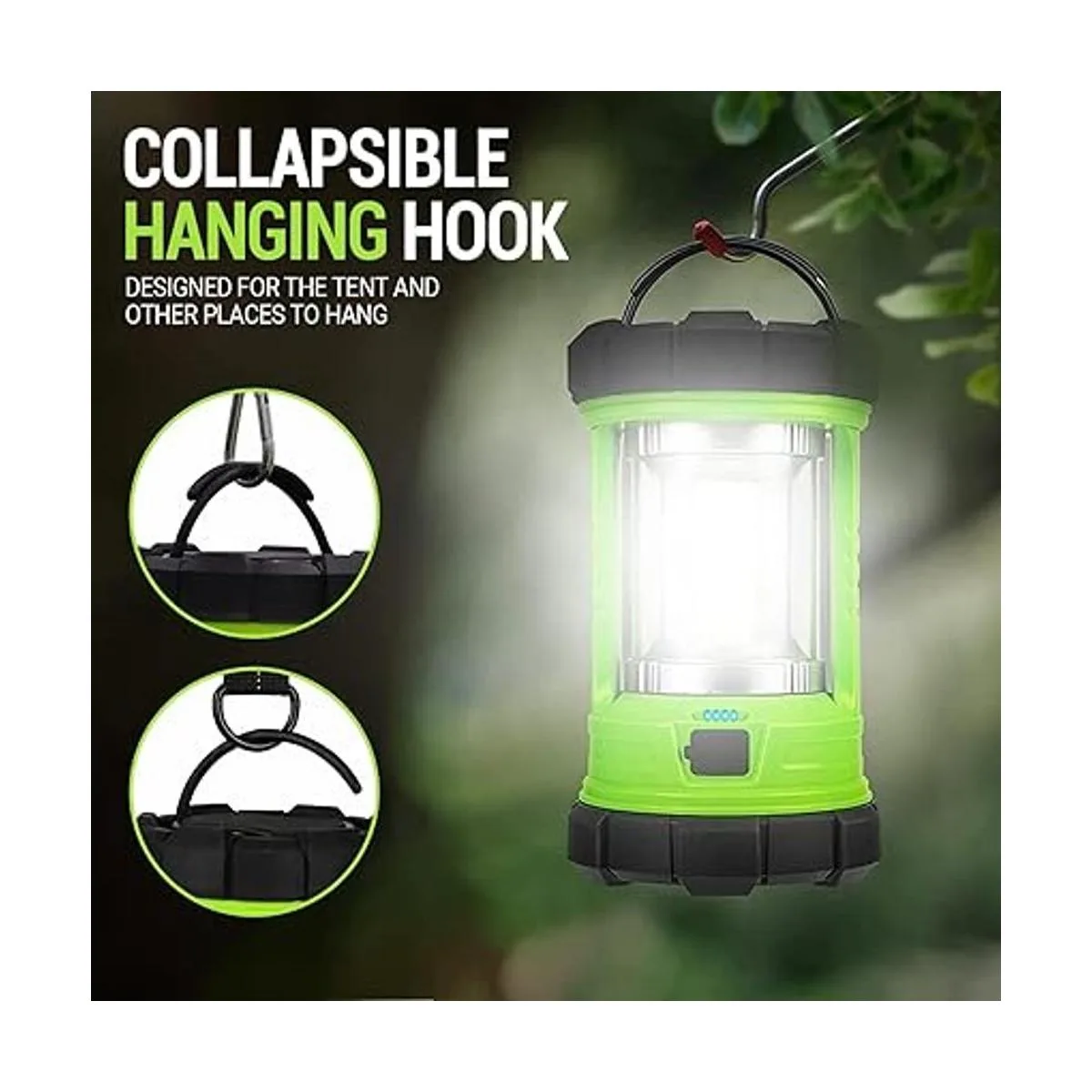 Ligera y portátil: esta linterna fiable tiene ganchos para un uso cómodo, mango integrado superior para un agarre ergonómico; el gancho retráctil permite que la luz de la tienda se cuelgue boca abajo de un árbol, gancho, poste de tienda de campaña y soporte.