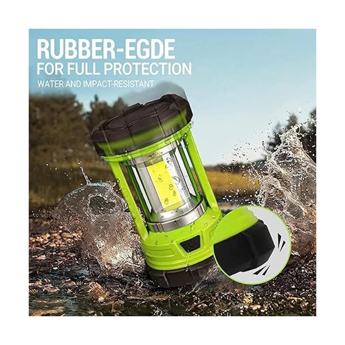 Resistente al agua y a los impactos: esta linterna de campamento es resistente a la lluvia, protegida contra el agua desde todos los ángulos. Con parachoques de goma que rodean la base, también es resistente a los impactos de 4.9 ft, para camping, senderismo y otras aventuras al aire libre.