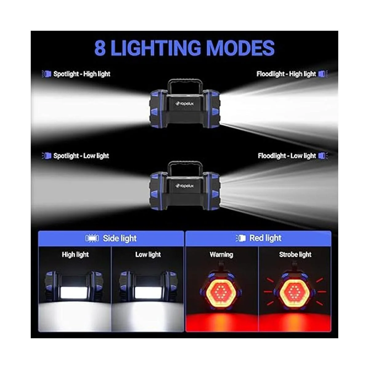 242 modos de luces Esta linterna de camping recargable tiene cabezales delanteros, traseros y luces laterales y un total de 8 modos de iluminación. La luz principal tiene 2 modos de luz alto, bajo, adecuado para iluminación lejana y cercana. La luz trasera tiene 4 modos alto, bajo, rojo, rojo estroboscópico, adecuado como luz de emergencia. El reflector lateral es de 2 modos alto, bajo, que se pueden utilizar como una luz de camping.