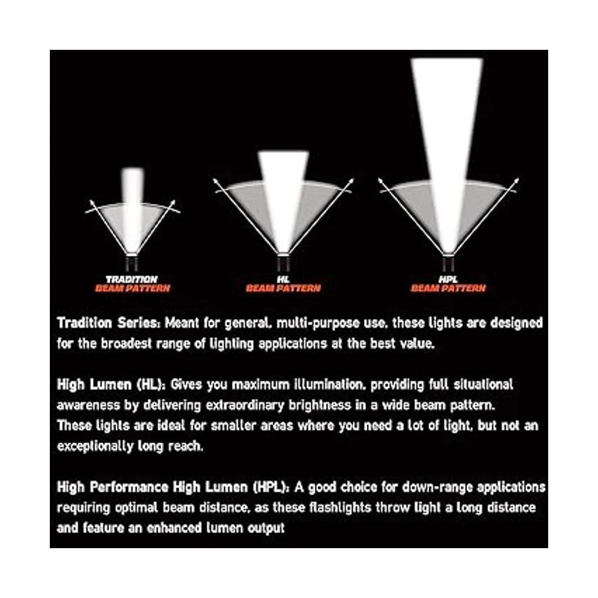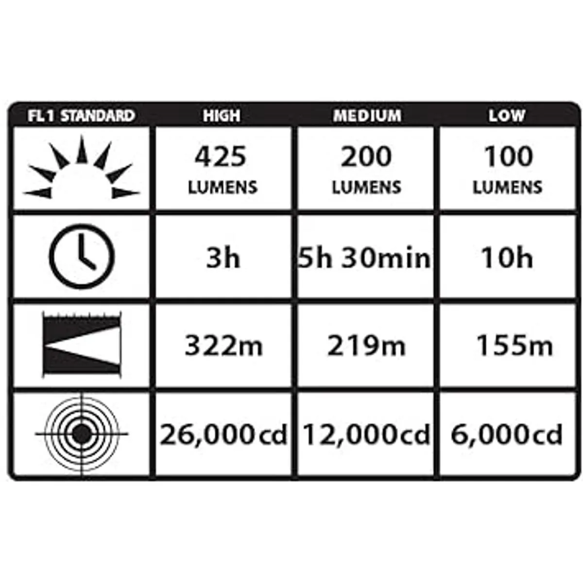 High for a high lumen, far reaching beam: 425 lumens; 26,000 candela; 322 meter beam; runs 3 hours