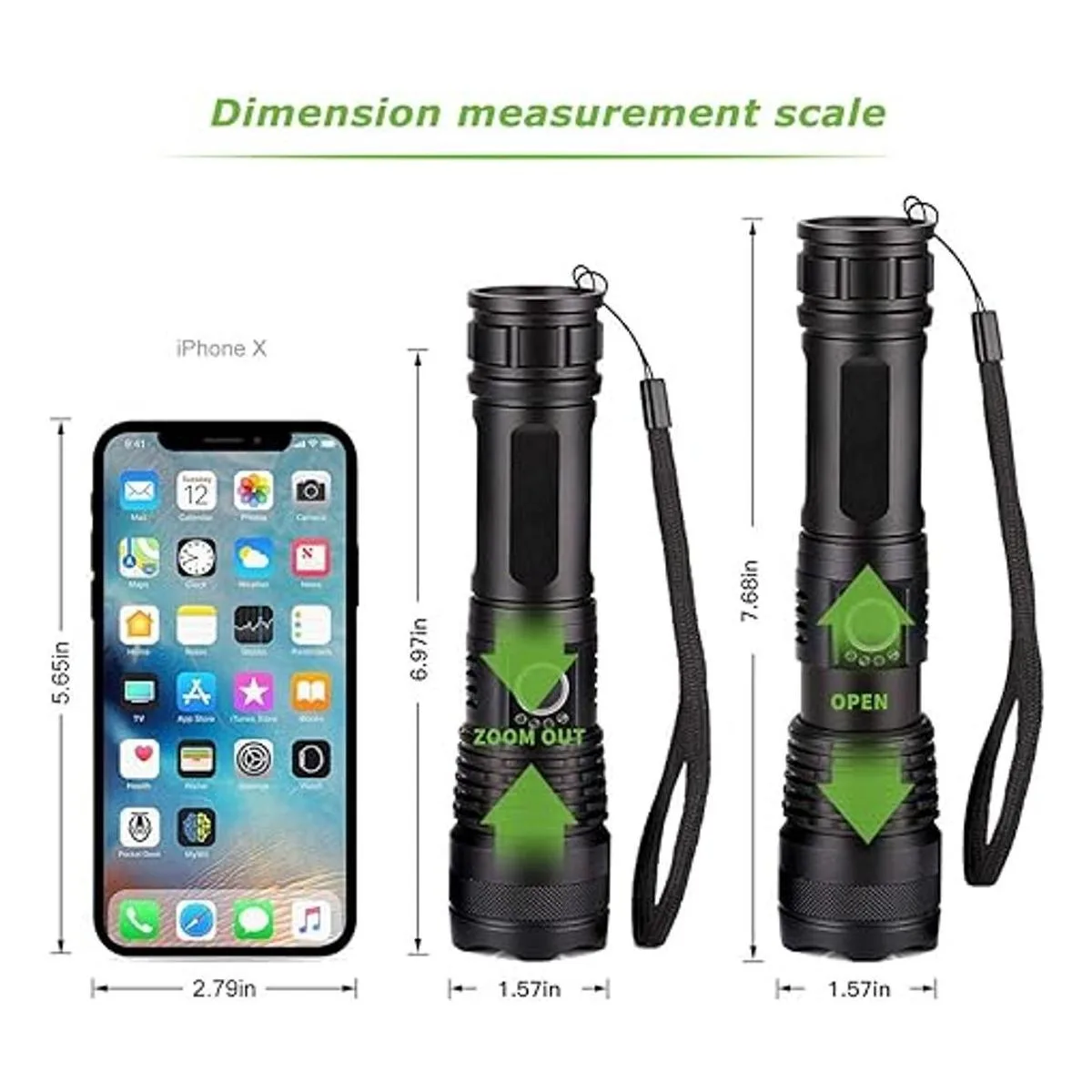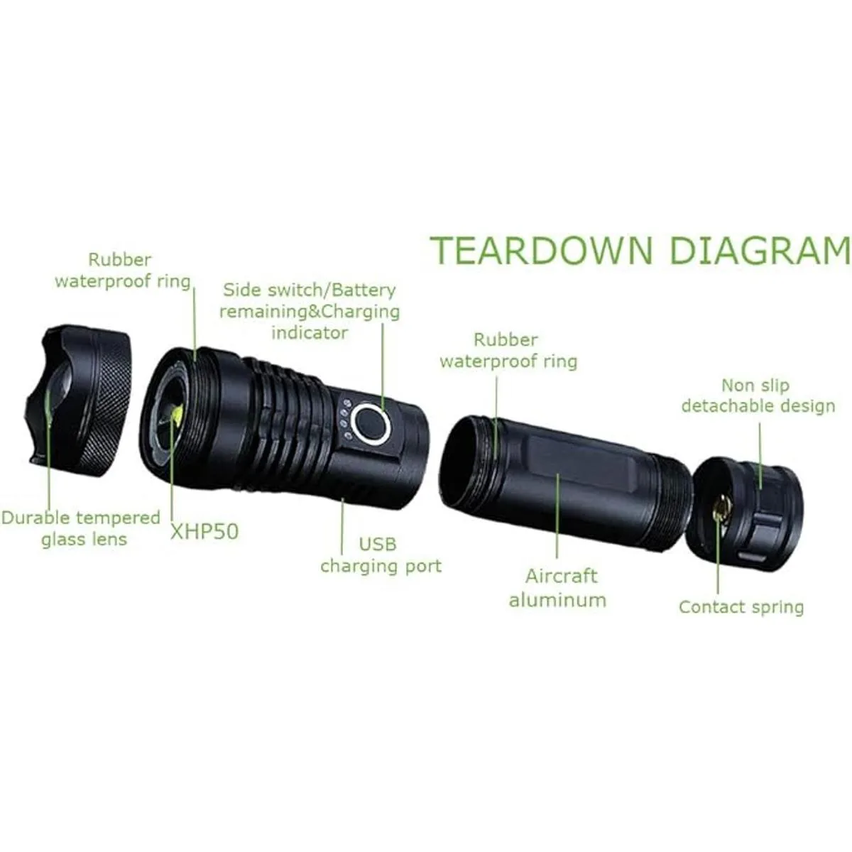 Brillo Para la primera vez que lo use, retira la lámina aislante de la batería. La última generación de chips LED XHP50 puede producir una salida ultraalta de hasta 5000 lúmenes, con una vida útil de hasta 50.000 horas. Ilumina donde quieras ir. Si no funciona correctamente, cárgala durante 1 o 2 horas.