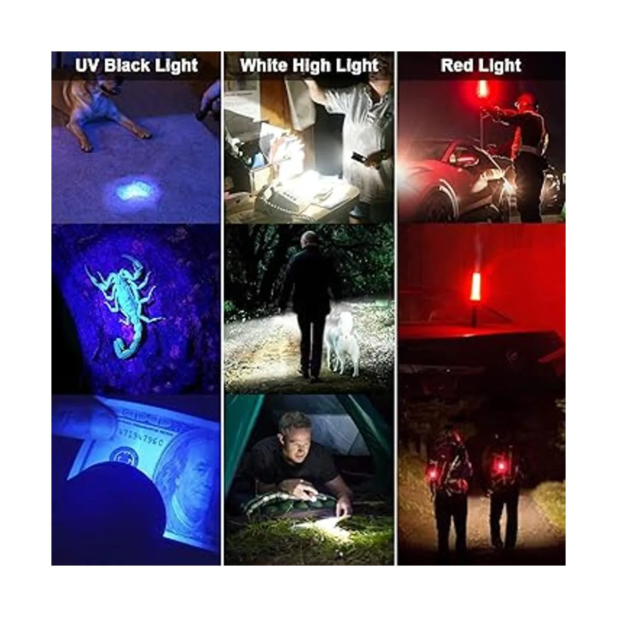 Como linterna de herramienta esencial con 3 luces todo en uno, cuando tienes la linterna de luz UV Spriak, tienes lo mejor. Como linterna de luz negra UV de 395 nm, puedes detectar más fácilmente la orina de las mascotas, las manchas de mascotas, ayudar a encontrar fluorescentes en la ropa de bebé, curar resina UV y pegamento, curar las uñas y autenticar monedas, licencia de conducir, pasaportes. Utiliza la luz blanca brillante para fines diarios y de trabajo. Utiliza la luz roja para advertencia en situaciones de emergencia, como varita de tráfico, luz SOS, luz de advertencia.