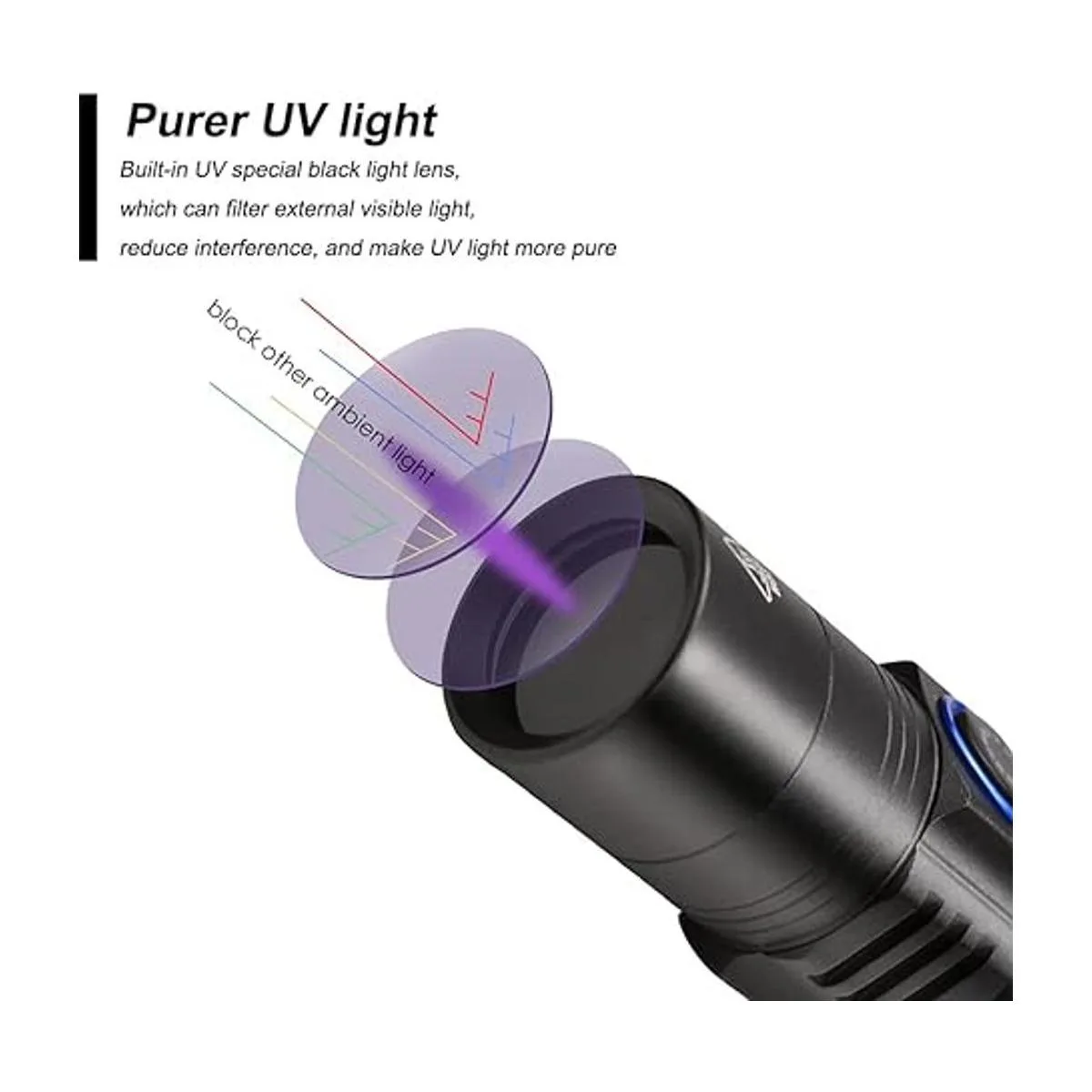 Luz negra profesional de 365 NM: la longitud de onda de 365 nm es más adecuada para la detección de agentes fluorescentes, códigos antifalsificación y otros requisitos altos, que es diferente de la linterna de onda larga de 395 nm. 365 nm es el mejor estándar para linternas UV