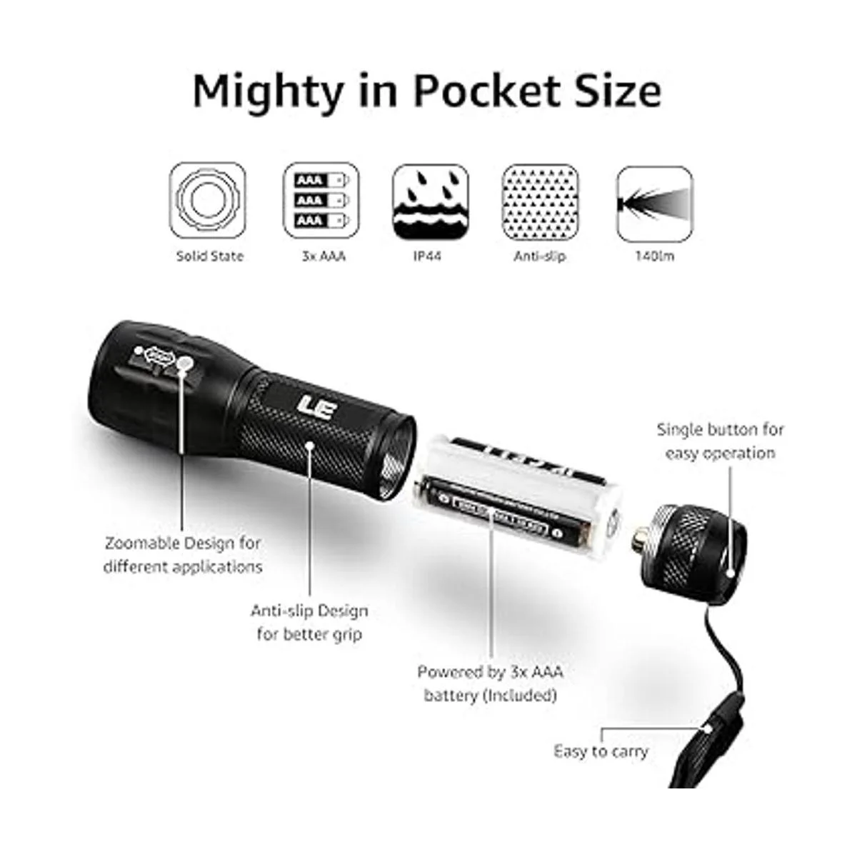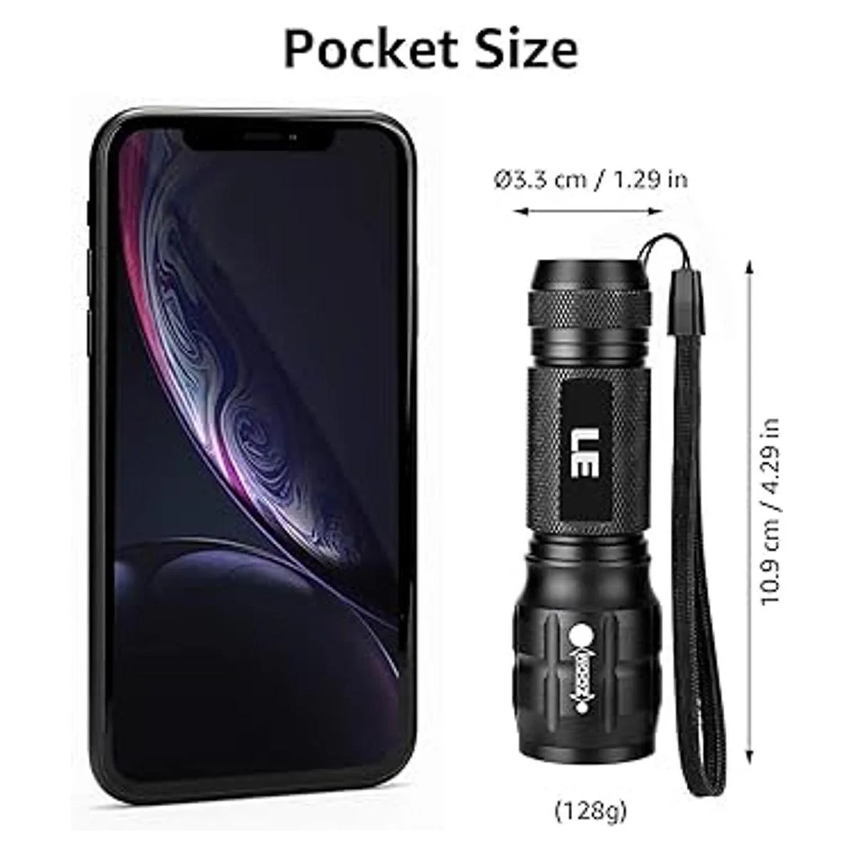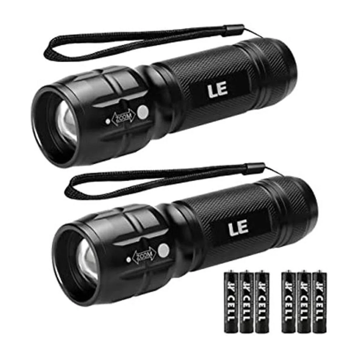 Linternas LED LE1000 lúmenes altos, luz de flash pequeña y extremadamente brillante, zoom resistente al agua, brillo ajustable para campamento, correr, emergencia, pilas AAA incluidas, 2 paquetes