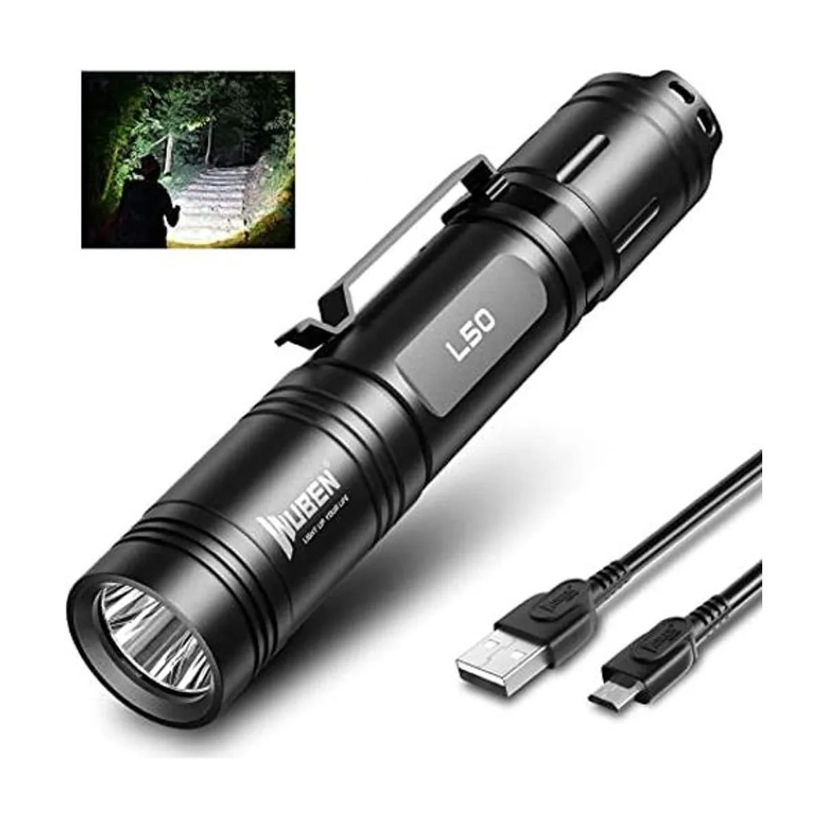 Linternas recargables: la linterna recargable WUBEN L50 adopta una selección LED P9 de reflector de aleación de aluminio suave y lente recubierta ultra blanca de doble cara para aumentar la transparencia de la luz, hasta 1200 lúmenes y proyección de haz de 656.2 ft, ilumina sin esfuerzo cada rincón de tu casa o campamento.