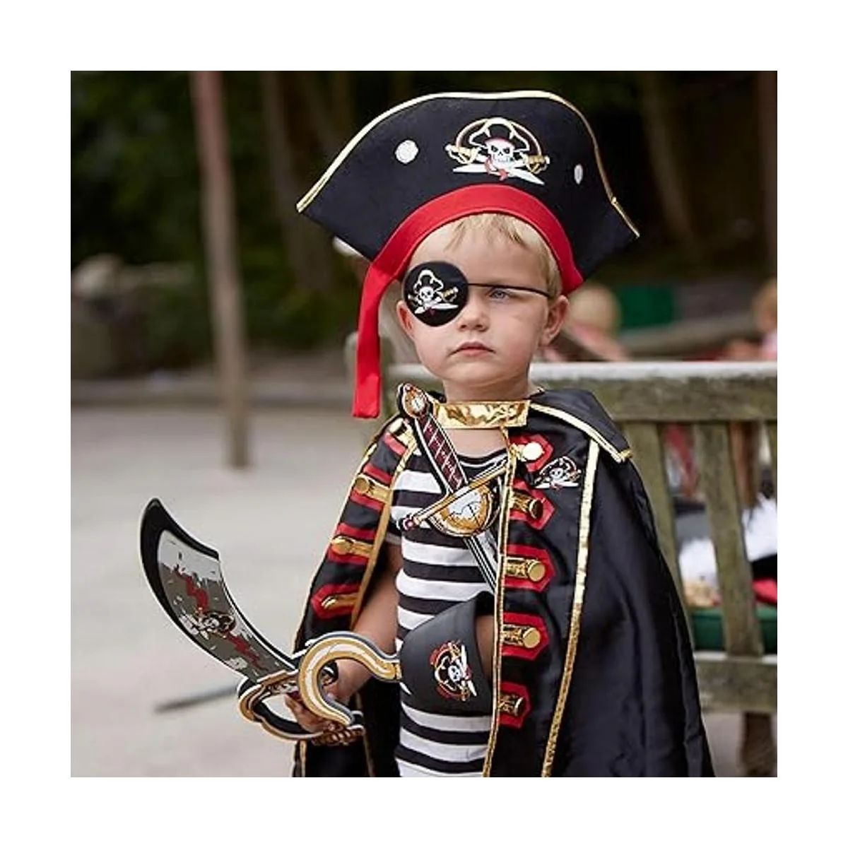 Parte de una línea completa de disfraces de pirata con armas de juguete, un sable, una epie, un gancho, una capa y un parche de ojo para vestirse como un feroz pirata