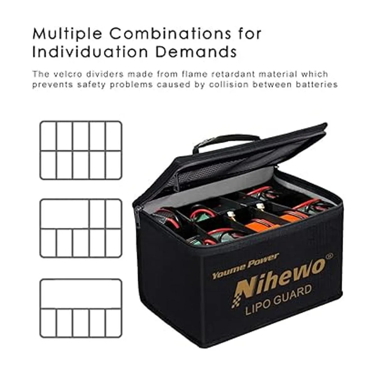 Múltiples formas de combinación y protección: la bolsa de almacenamiento ignífuga se puede combinar de muchas maneras. 9 separadores de velcro que pueden ajustar las salas de almacenamiento de baterías, cómodo y seguro. Es una forma conveniente de proteger tus baterías Lipo. Libera tu mente cuando la lipo esté en carga, mientras que tienes que dejarlo por un tiempo cerrando los lipos en la bolsa. La bolsa LIPO SAFE está diseñada para reducir las posibilidades de daños en caso de incendio de lipo.