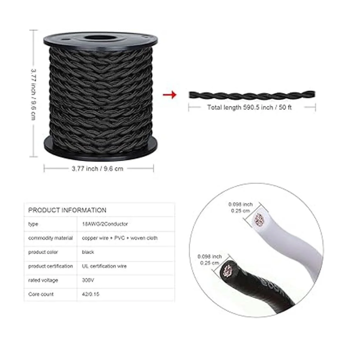 Listado UL Cable de tela trenzada de 50 pies, cable electrónico industrial antiguo Carry360, calibre 18, 2 conductores, lámpara de tela de estilo vintage, cable de tela colgante negro