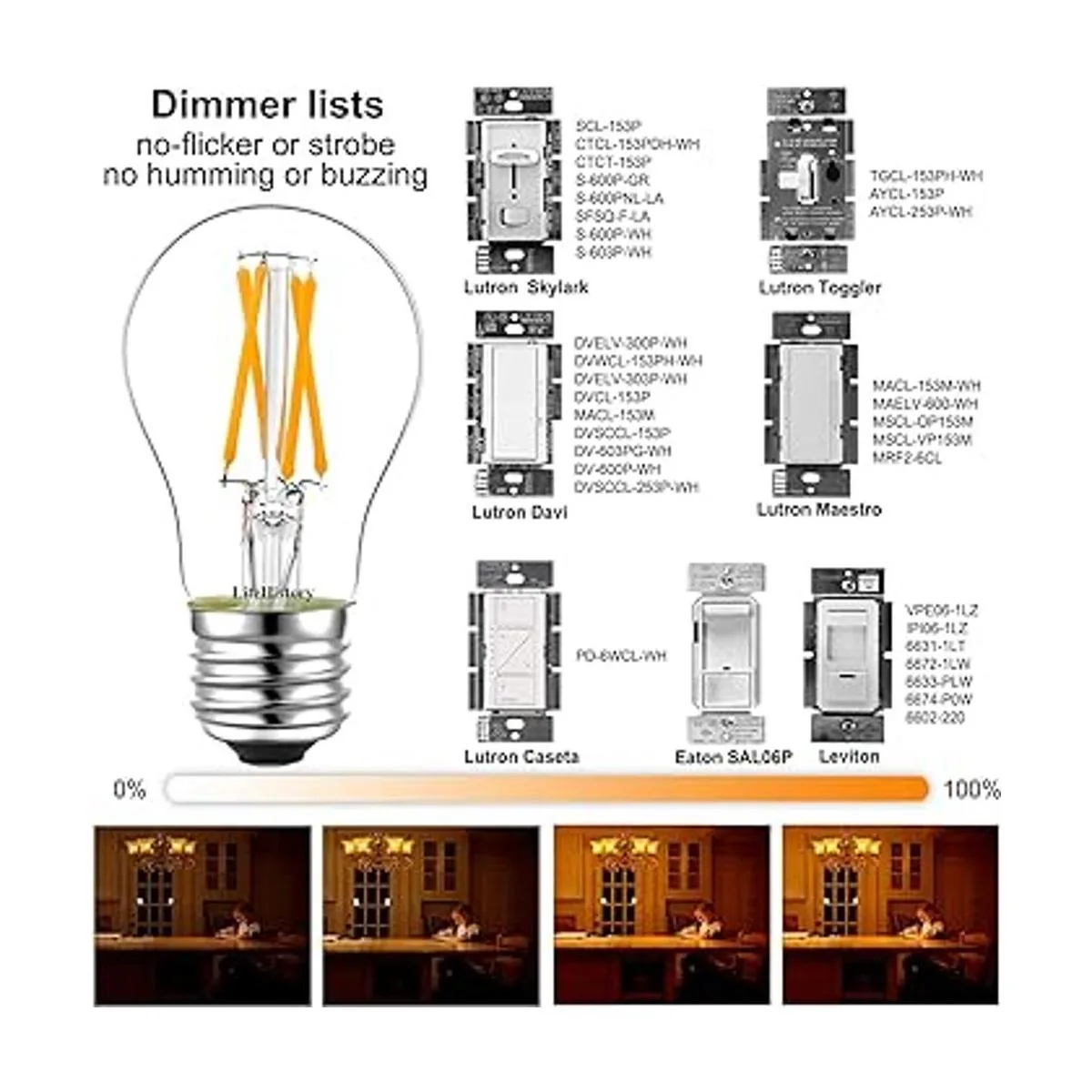 Compatibilidad regulable y sin parpadeo : la bombilla LED A15 es de atenuación suave, sin parpadeo o estroboscópico, sin zumbidos o zumbidos, compatible con Lutron Skylark, Davi, Toggler, Maestro, regulador de intensidad preestablecido rotativo SCL153PWH, CTCL153PDHWH, TGCL153PHWH, MAELV6600000000000000000000000000000000000000000000000000000000000000000000000000000000. 00WH. S600PGR,DVELV300PWH,DVWCL153PHWH,DV600PWH,D600PIV,DVELV303PWH,MACL153MWH,S600PNLLA, Leviton VPE061LZ, IPI061LZ, 66721LZ, 666721LZ. LW, Levit. en 6633PLW, 66311LT regulador