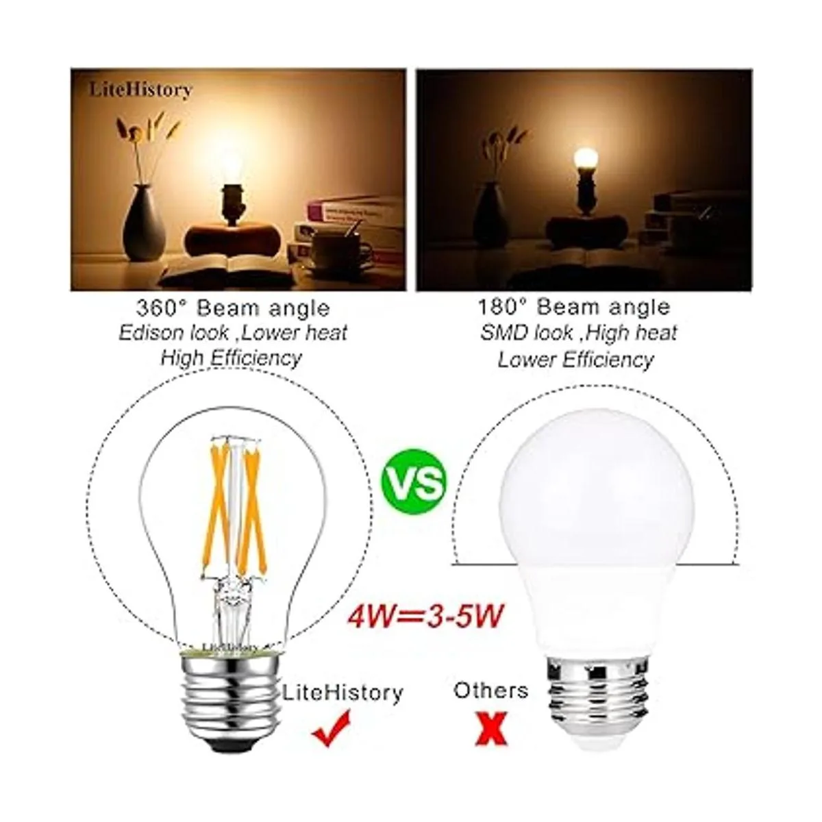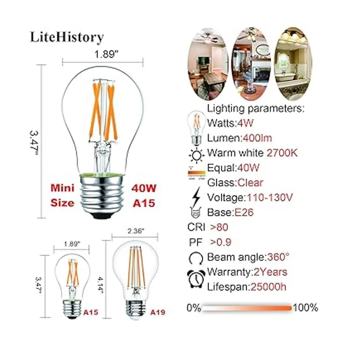 LiteHistory Bombilla LED A15 regulable de 4 W igual a 40 W e26 bombilla LED AC120V Vintage LED Edison bombilla para ventilador de techo, bombilla de electrodomésticos y bombilla de refrigerador, blanco cálido, 2700 K, 400 lm, 4 unidades