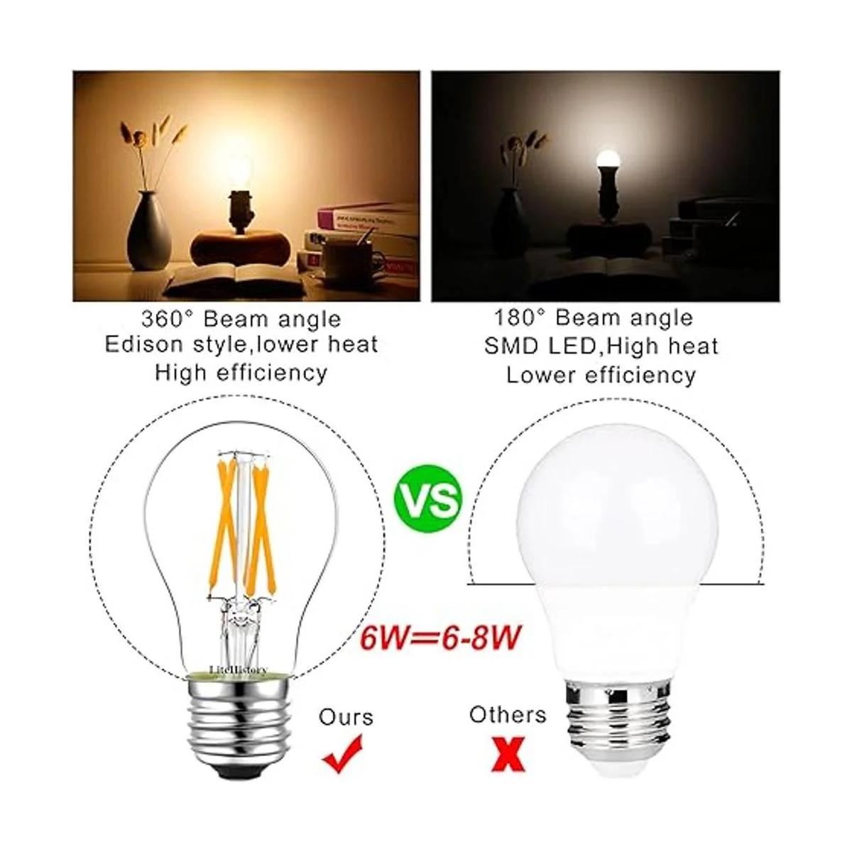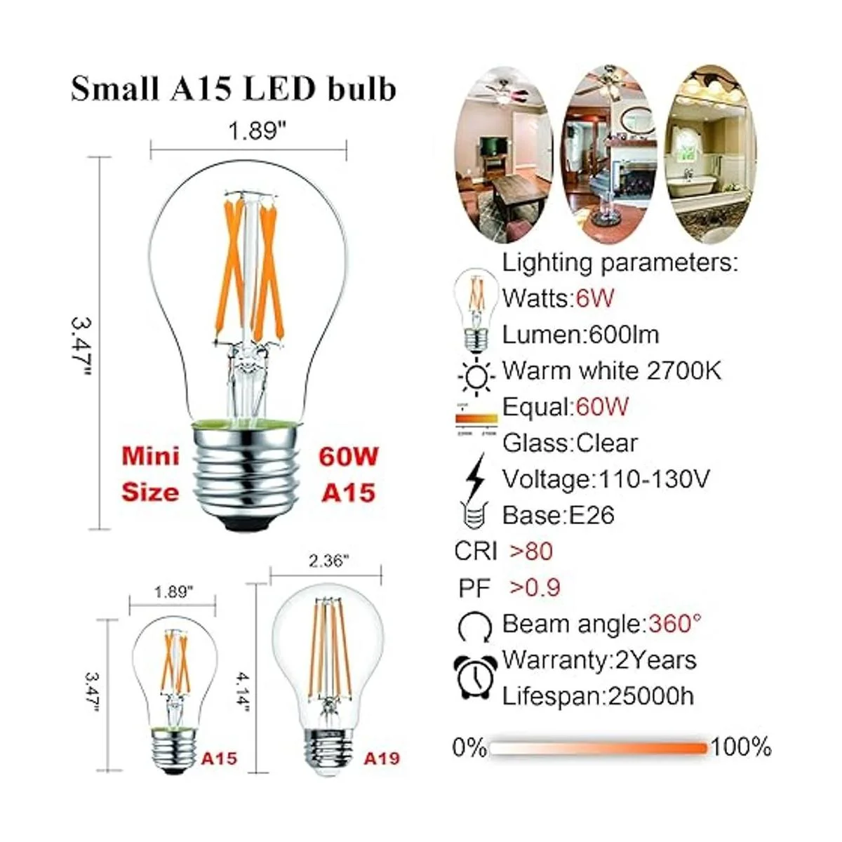LiteHistory Bombilla LED E26 equivalente a 6 W bombilla de 60 W no regulable A15 LED Edison para ventilador de techo, apliques de pared, nevera, lámpara de escritorio, blanco cálido, 2700 K 600 lm AC120 V, paquete de 6 unidades