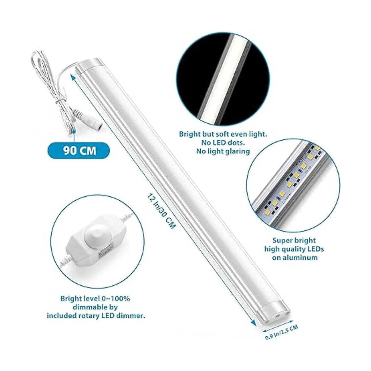 Kit de iluminación de armario superbrillante pero ajustable. Esta barra de luz LED de 12.0 in es muy brillante. 5 W/300 lúmenes. Sin embargo, puedes utilizar el regulador de intensidad LED de 0 100 incluido para elegir tus niveles de brillo preferidos