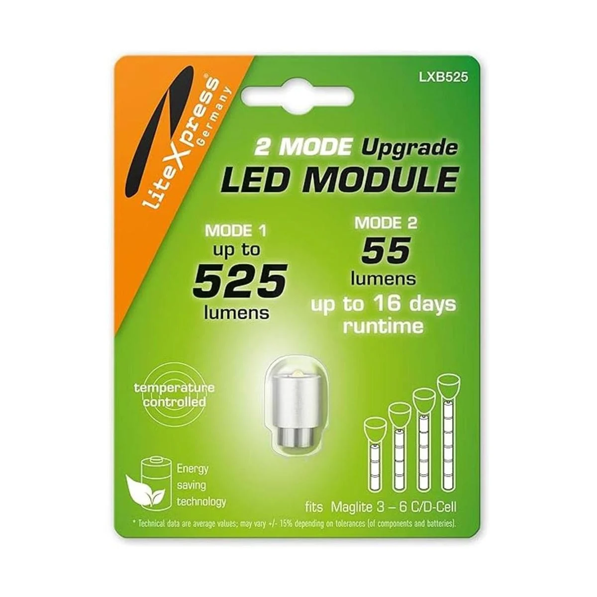 LiteXpress LXB525 Módulos de actualización LED de 2 modos de 525 o 55 lúmenes solo para linternas magnéticas de 37 células C/D, no utilizar para maglita de 2 celdas