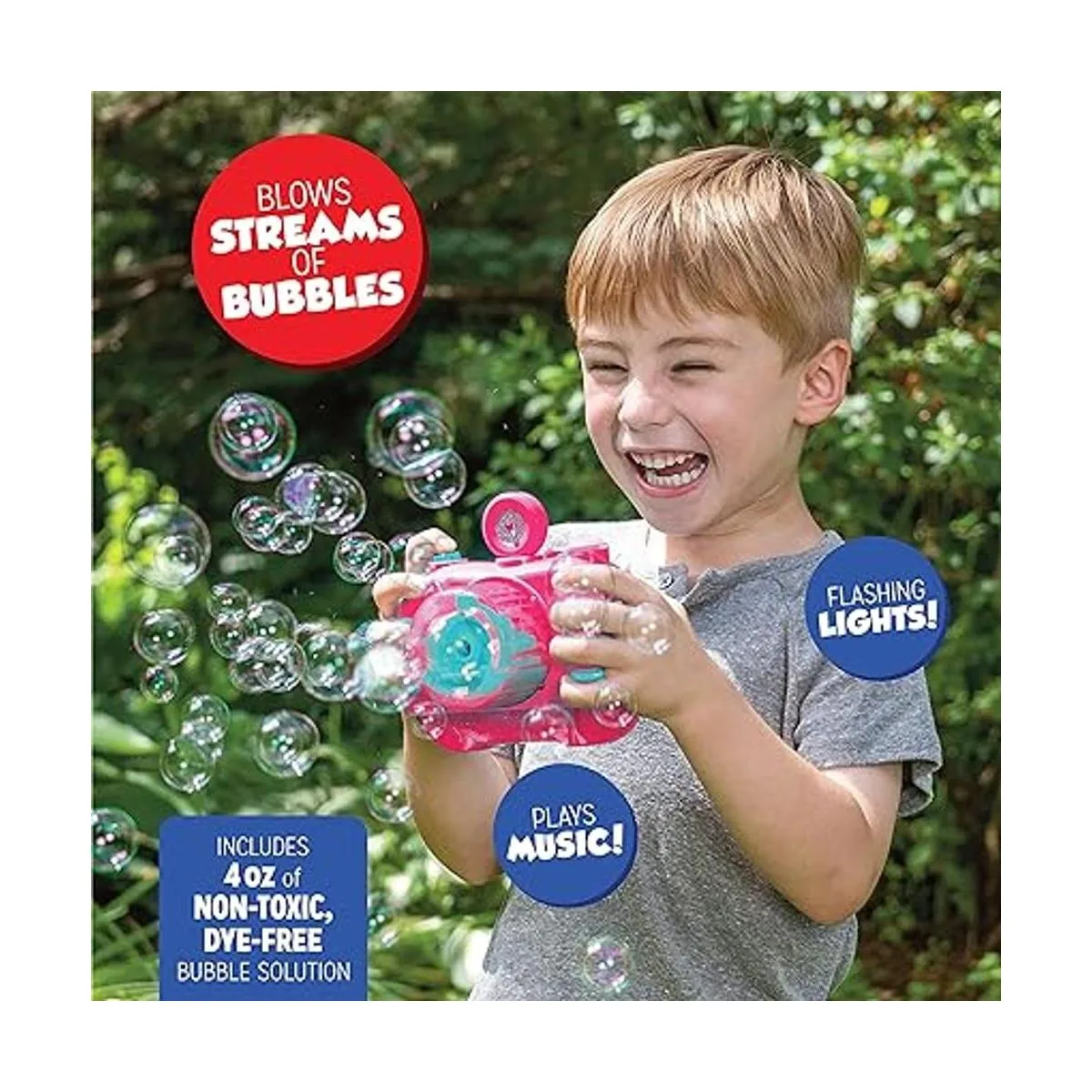 La cámara de burbujas es el juguete perfecto que permite a tu hijo fingir tomar fotos con el sonido realista del obturador todo mientras sopla flujos continuos de burbujas, luces de remolino y música divertida.