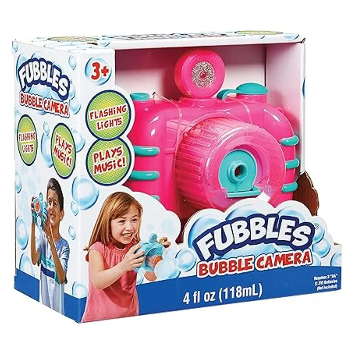 Este juego incluye la cámara Fubbles Bubble en rosa con música y luces y nuestra solución de burbujas no tóxicas Premium Fubbles. Funciona con 4 pilas AA, no incluidas.