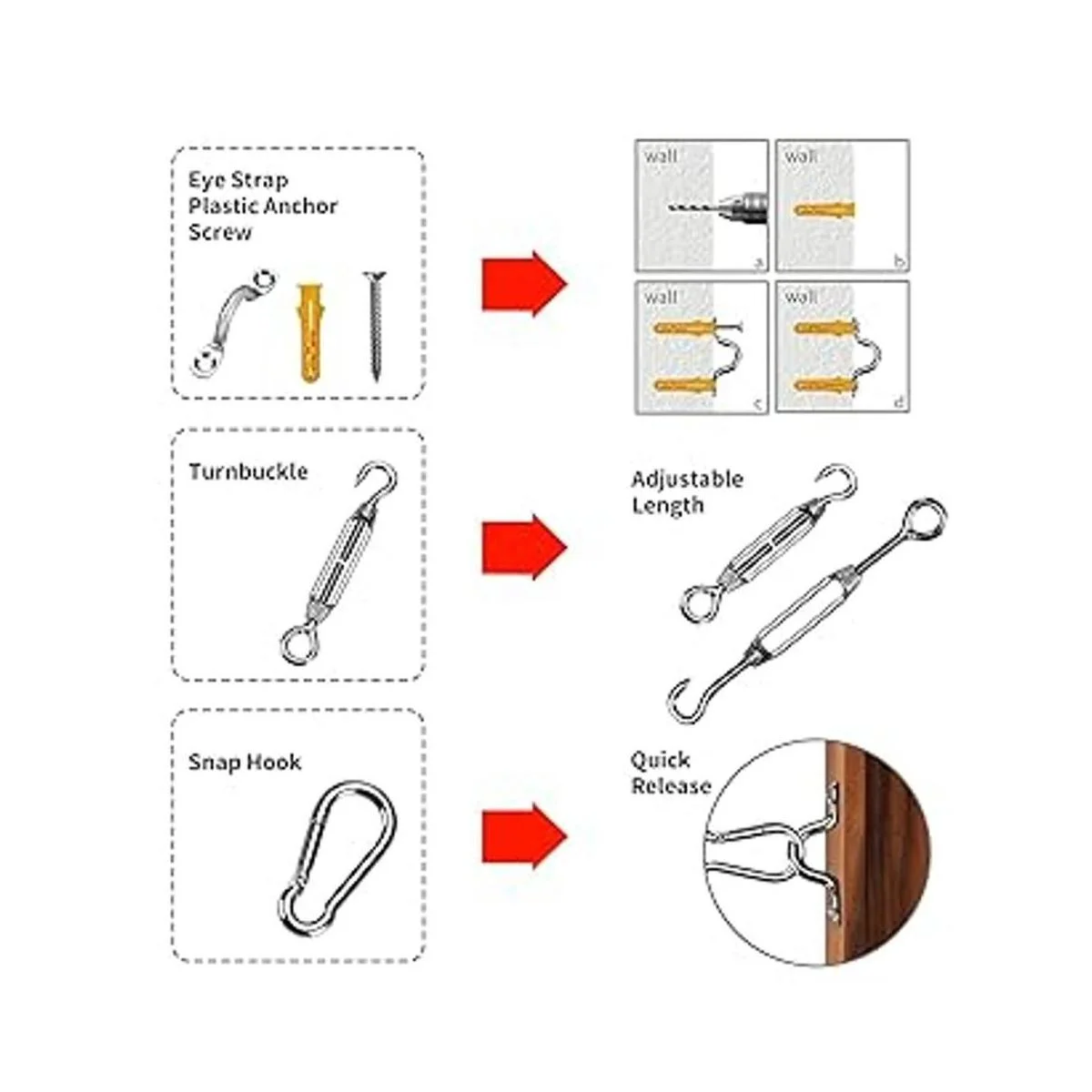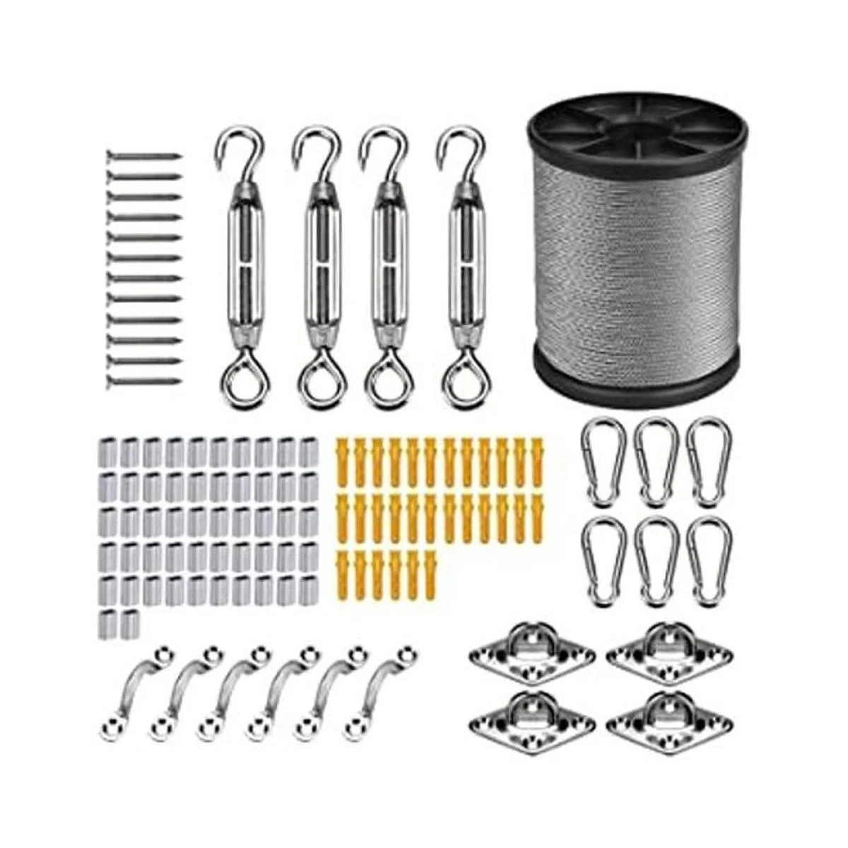Múltiples accesorios: este paquete proporciona casi todo el kit que necesitas, incluyendo cable de acero inoxidable 304 de 164 pies de longitud; 4 tensor M5, 6 ganchos adjuntos, 6 correas de ojo, 30 anclajes de plástico, 30 tornillos, 4 ganchos de hamaca de techo, 52 mangas de aluminio.