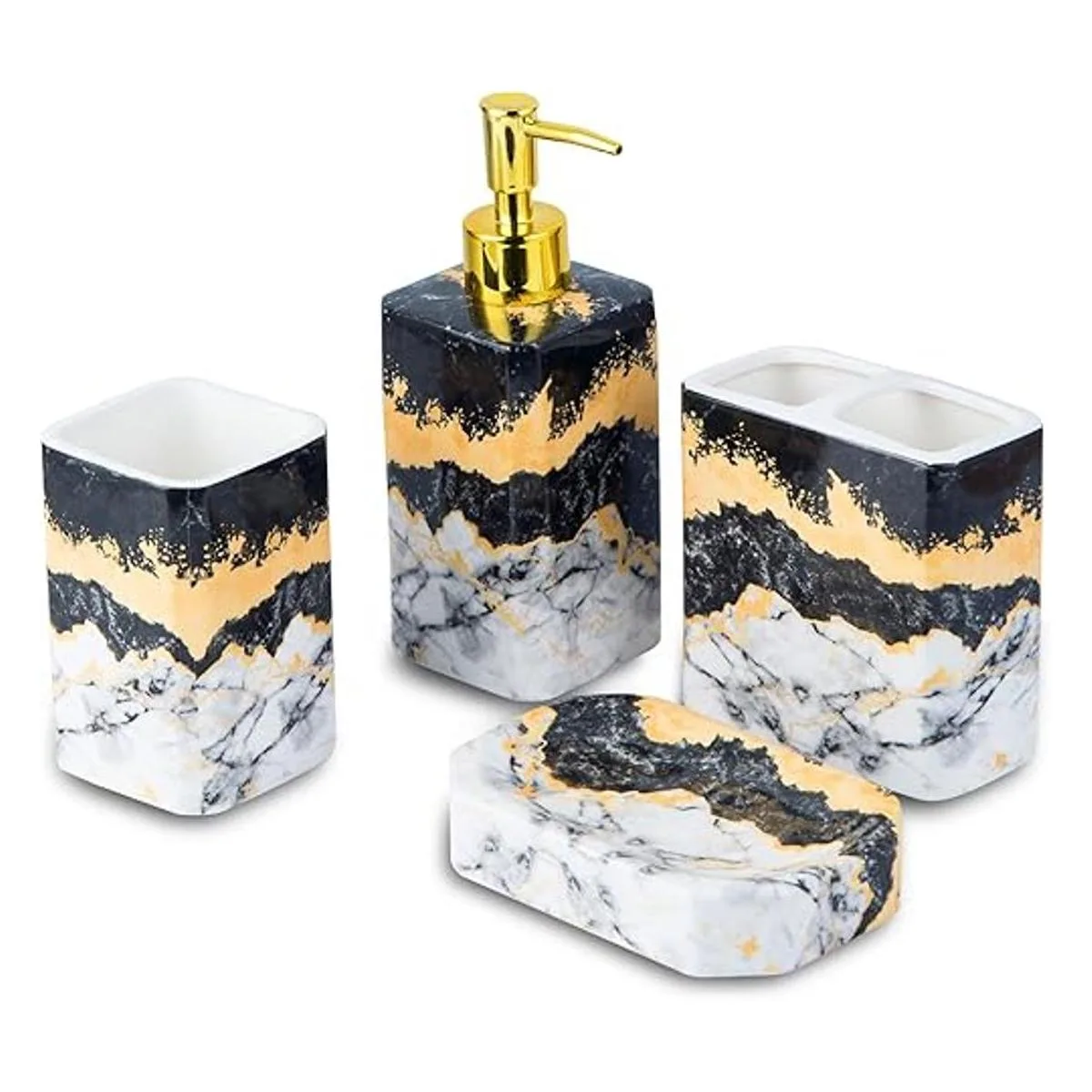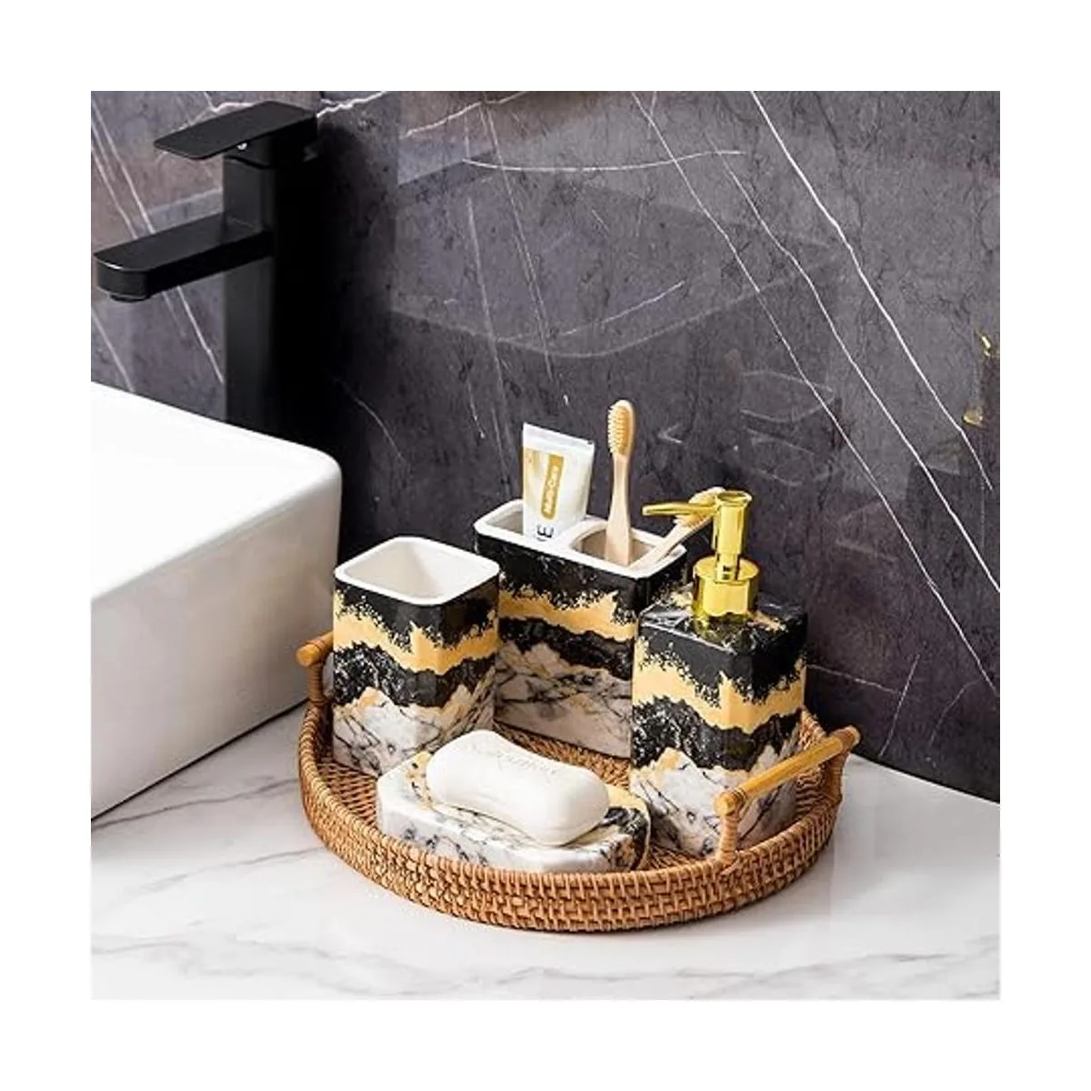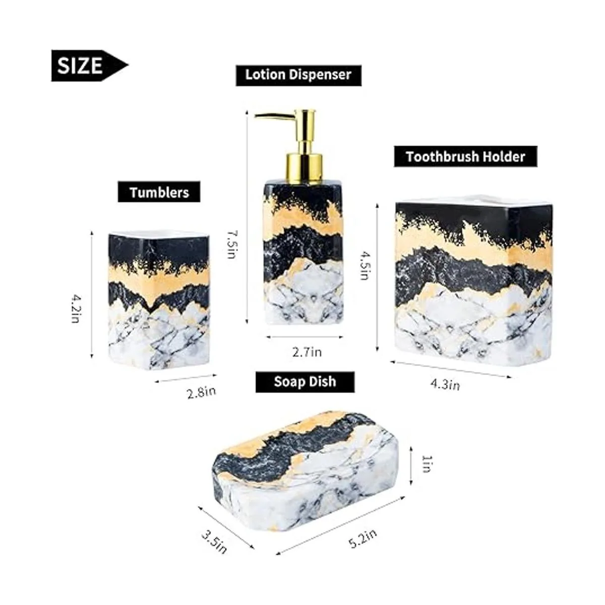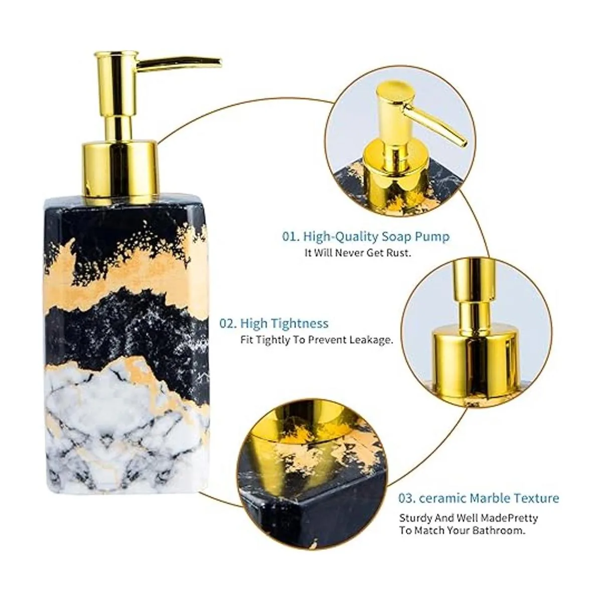 Juego completo: el juego de accesorios de baño dorados y la decoración incluyen 1 jabonera redonda, un dispensador de loción/bomba de jabón, un soporte para cepillo de dientes y un vaso. Mantén las encimeras de baño limpias y limpias.