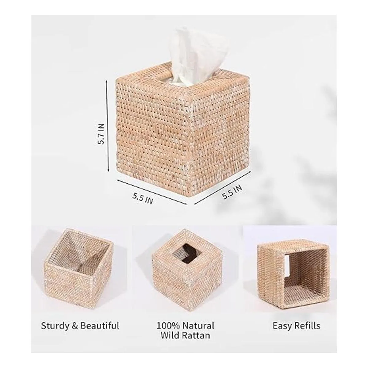 Tamaño perfecto: tamaño exterior: 5.5 pulgadas de largo x 5.5 pulgadas de ancho x 5.7 pulgadas de alto. Tamaño interior: 5 pulgadas de largo x 5 pulgadas de ancho x 5.2 pulgadas de alto, ha sido capaz de contener todas las cajas de pañuelos cuadradas de tamaño estándar.
