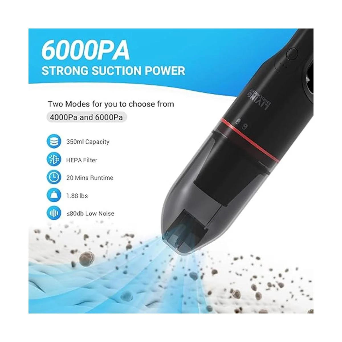 Potente succión: la aspiradora de coche proporciona una fuerte succión y un motor fuerte, dos tipos de modos de succión, 4000 Pa y 6000 Pa que pueden absorber fácilmente el polvo, pelo de mascotas, arena, grava, residuos de alimentos.