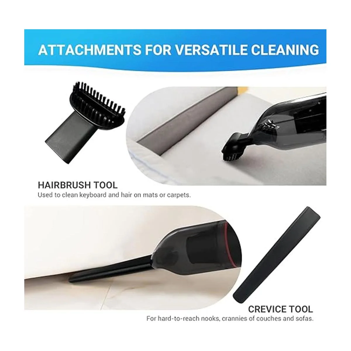 Limpieza rápida y fácil: esta aspiradora portátil viene con una herramienta de boquilla para grietas y boquilla de cepillo, herramienta de cepillo para satisfacer diferentes necesidades de limpieza, de acuerdo con la necesidad de limpiar el polvo en diferentes ocasiones, el reemplazo de diferentes bocas de succión, mejor efecto.