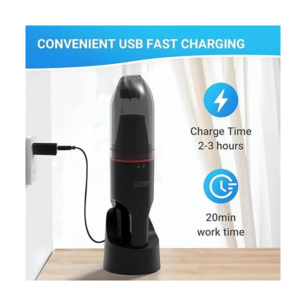 Carga rápida y mayor capacidad: esta mini aspiradora se carga por el cable de carga USB a CC, se carga con un cargador de batería de litio de 2000 mAh, el tiempo de carga es de aproximadamente 2 a 3 horas, lleno de unos 20 minutos de uso sostenible.