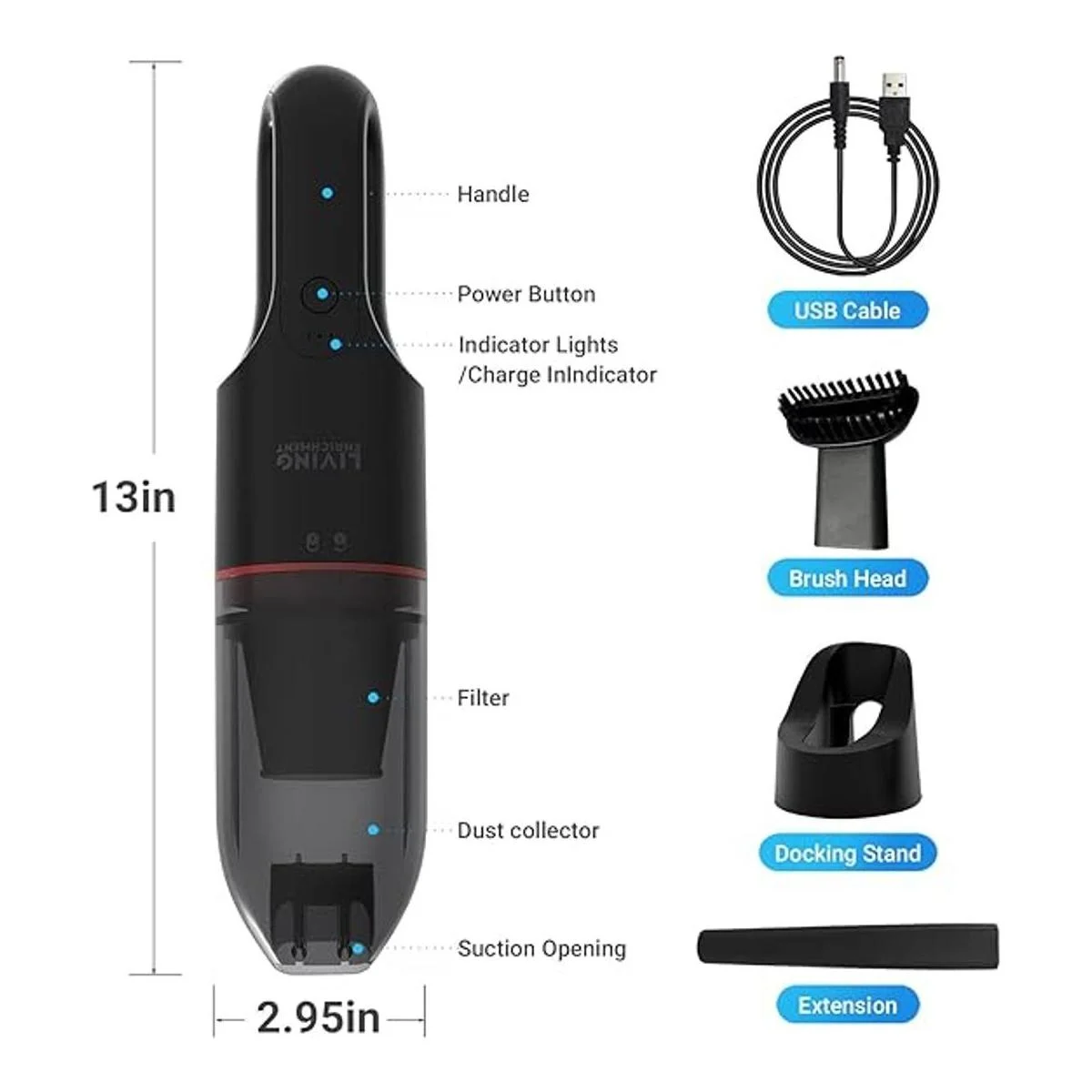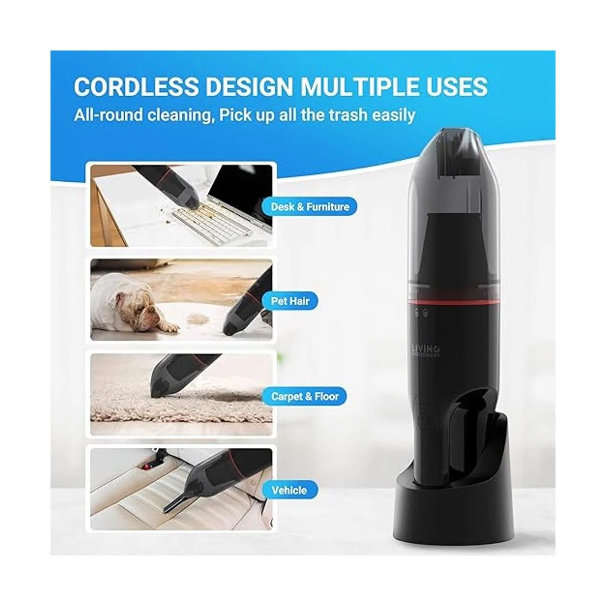 Living Enrichment Aspiradora de mano, aspiradora recargable de automóvil, rompepolvo recargable inalámbrica, potente succión, con boquilla de hendidura y cepillo de limpieza, color negro