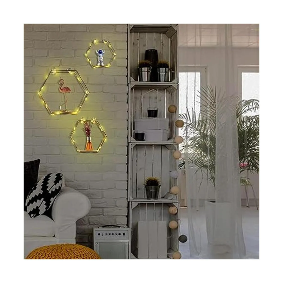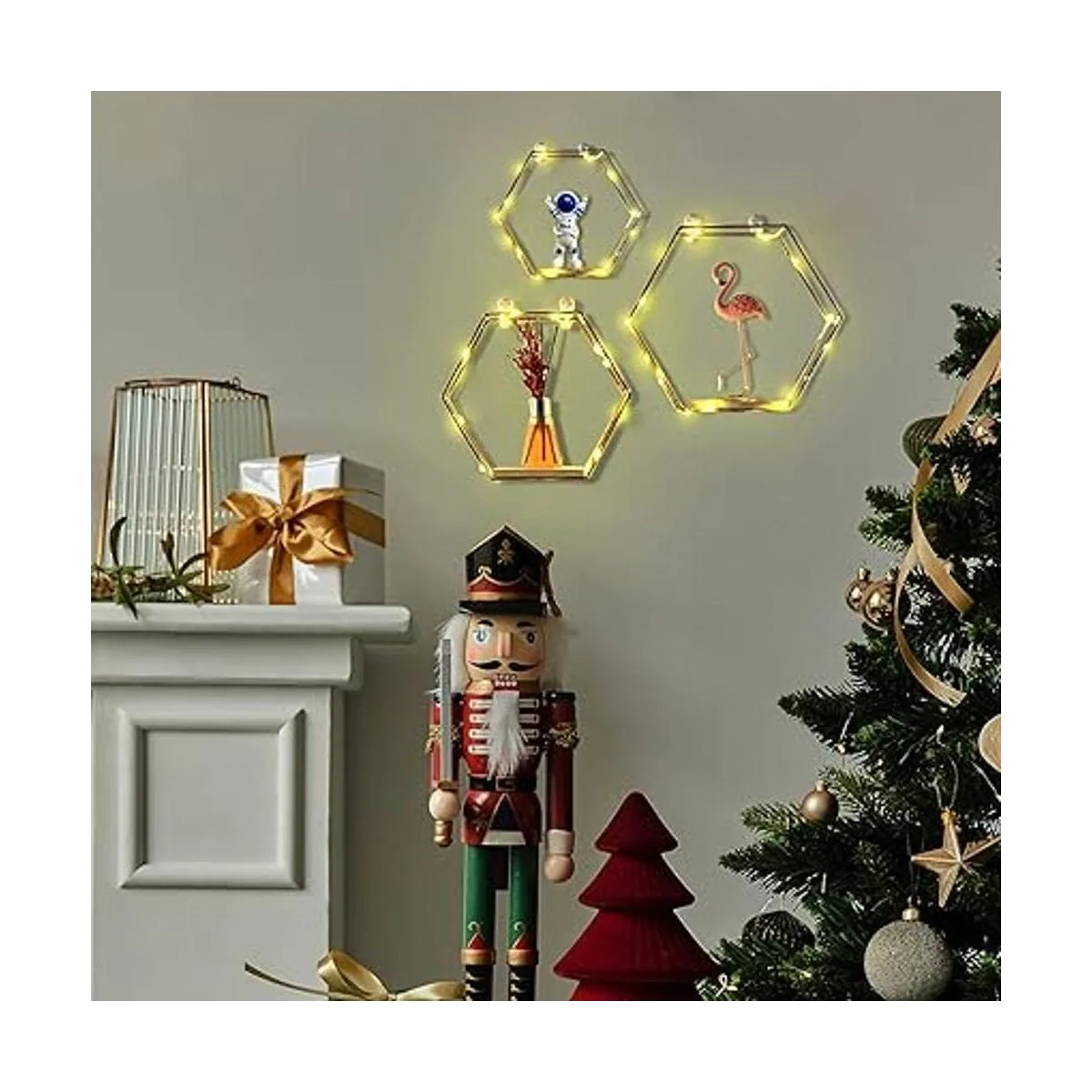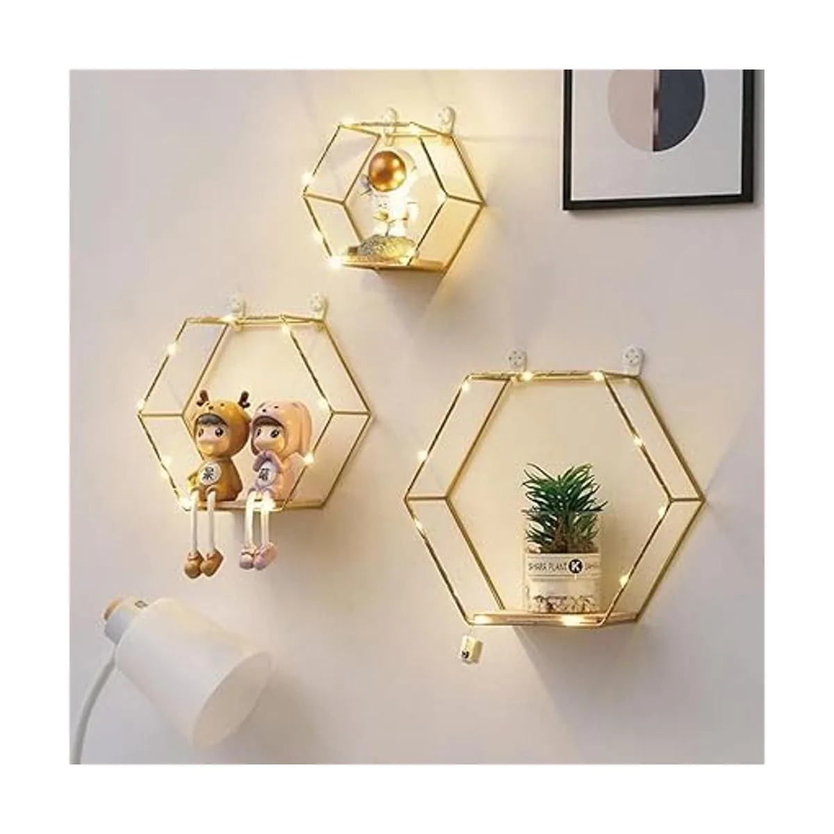 Liywall Estantes flotantes hexagonales, decoración de pared, alambre de metal dorado y estante de almacenamiento montado en la pared, decoración del hogar, arte para dormitorio, sala de estar, cocina, baño, juego de 3 con luces LED