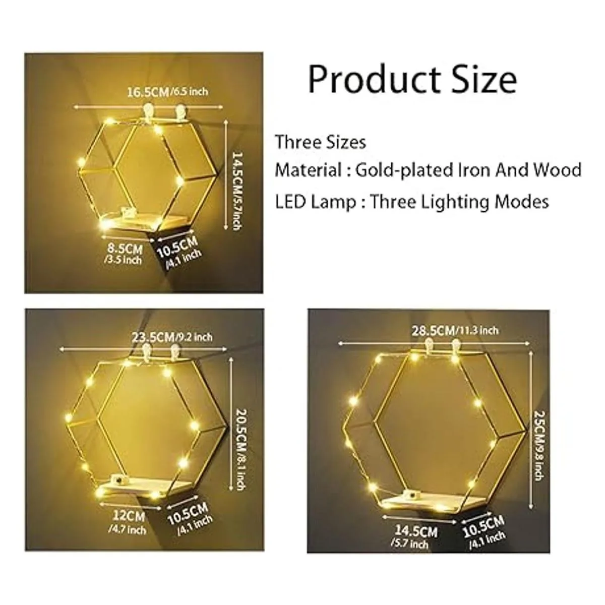 Juego de 3 estantes flotantes geométricos hexagonales. Tamaño: grande 11.3 x 9.8 x 4.1 pulgadas, mediano 9.2 x 8.1 x 4.1 pulgadas, pequeño 6.5 x 5.7 x 4.1 pulgadas. Diseñado con alambre de metal duradero y madera con luces.