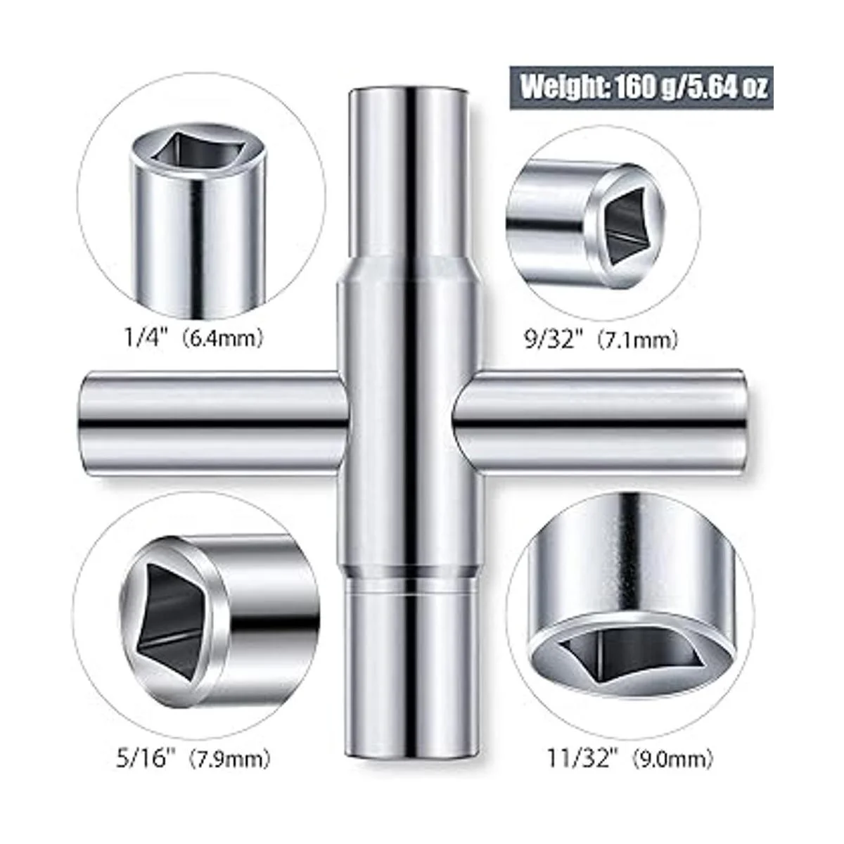 Diseño 4 en 1: las llaves de 4 vías están diseñadas en forma de cruce, compatibles con tallos de 1/4 pulgadas, 9/32 pulgadas, 5/16 pulgadas y 11/32 pulgadas, ahorrando tiempo y esfuerzo para aflojar los baberos de manguera