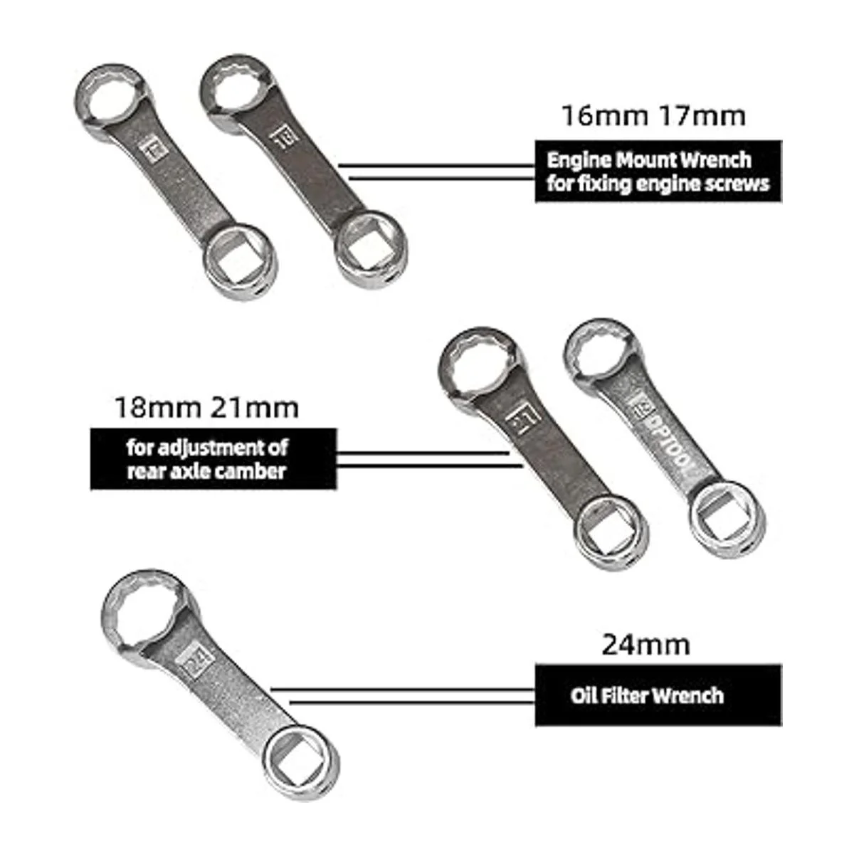 Amplio uso: este kit de llaves tiene una amplia gama de usos, llave de 0.630 in y 0.669 in para quitar las tuercas del tornillo de fijación del motor sin bloqueo. Llave de compensación de 0.709 in y 0.827 in para ajustar la inclinación del eje trasero. Llave de extracción de filtro de aceite de 0.945 in diseñada para modelos con motores de riel común con cajas de cambios DSG. El cambio de aceite se puede hacer sin quitar la batería. Es una herramienta indispensable para la reparación diaria de coches