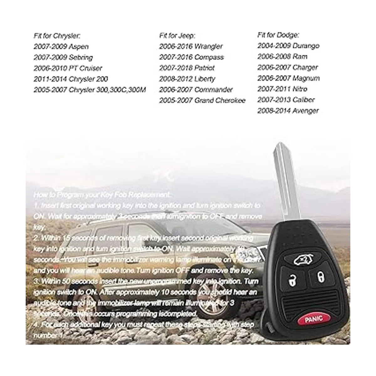 Componentes compatibles: esta llave de coche remota funciona como un reemplazo para llaves remotas con ID FCC: OHT692427AA, 56040649ac, 56040649, 05175789AA, 05175786AA, 05175817AA. Compatible con Dodge Charger Magnum 20062007/Jeep Commander 20062007/Grand Cherokee 20052007/Liberty 20082012.