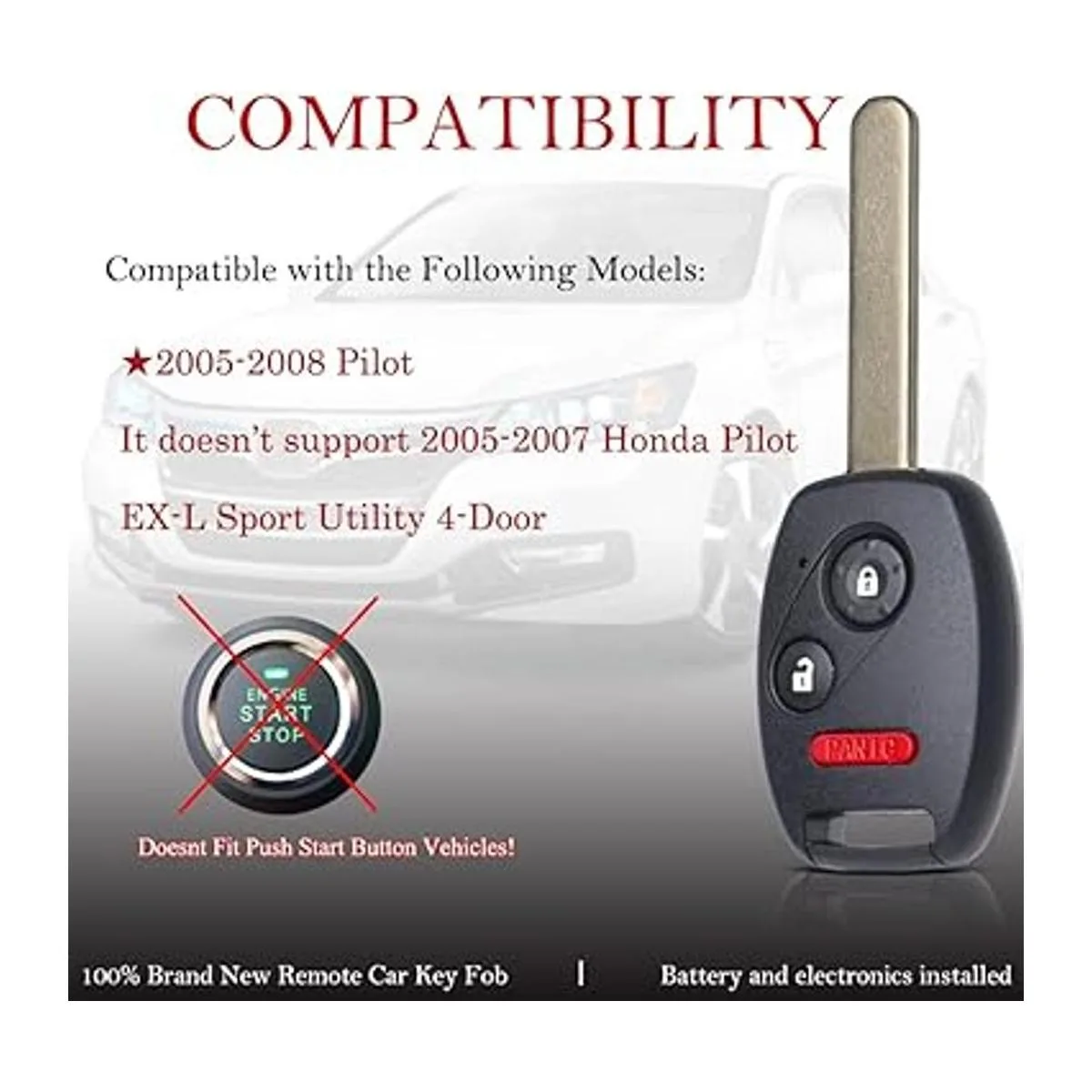 Reemplazo: este llavero remoto de repuesto es compatible con Honda Pilot 20052008. Nota: no es compatible con Honda Pilot EXL Sport Utility 20052007.
