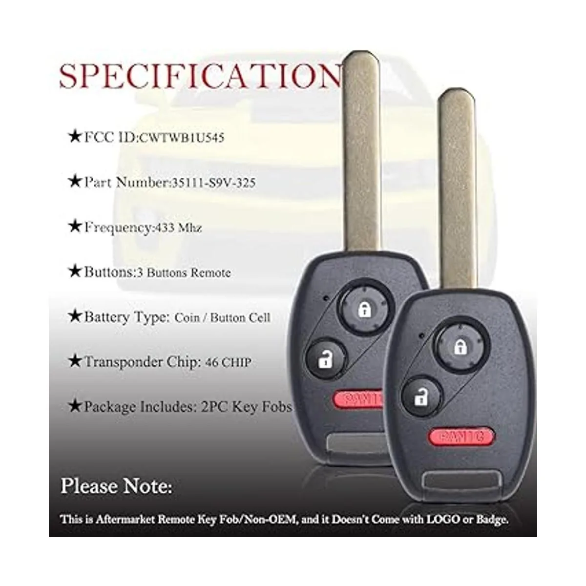 Compatibilidad: este mando a distancia de entrada sin llave de repuesto para llave de coche es compatible con números de pieza: 35111S9V325 y FCC ID: CWTWB1U545. Comprueba nuestra descripción del producto y la herramienta de ajuste del vehículo para ver la lista completa de vehículos compatibles.