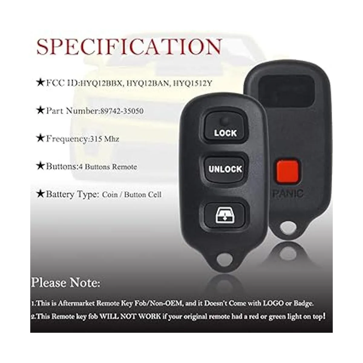 Llavero de repuesto remoto compatible con Toyota 4Runner 1999 2000 2001 2002 2003 2004 2005 2006 20072009Sequoia 20012008 HYQ12BBX con control remoto de entrada sin llave HYQ12BANHYQ12BANHYQ12BANHYQ12 512 años. 8974235050 paquete de 2