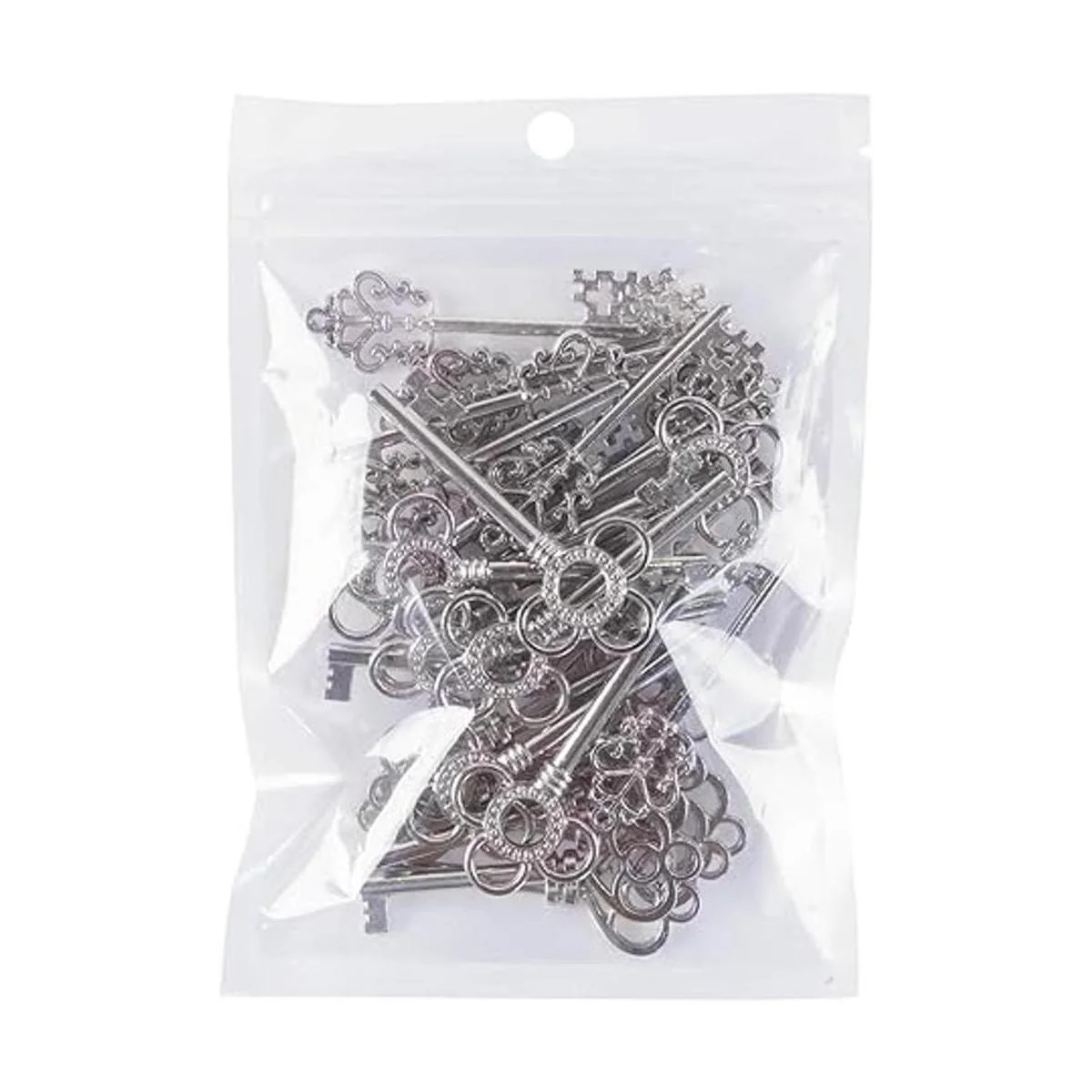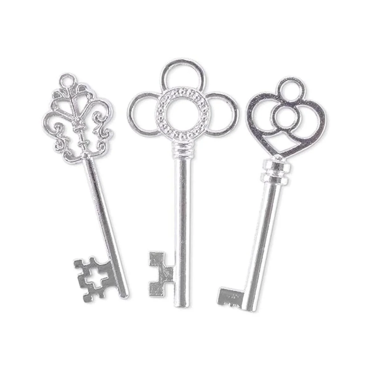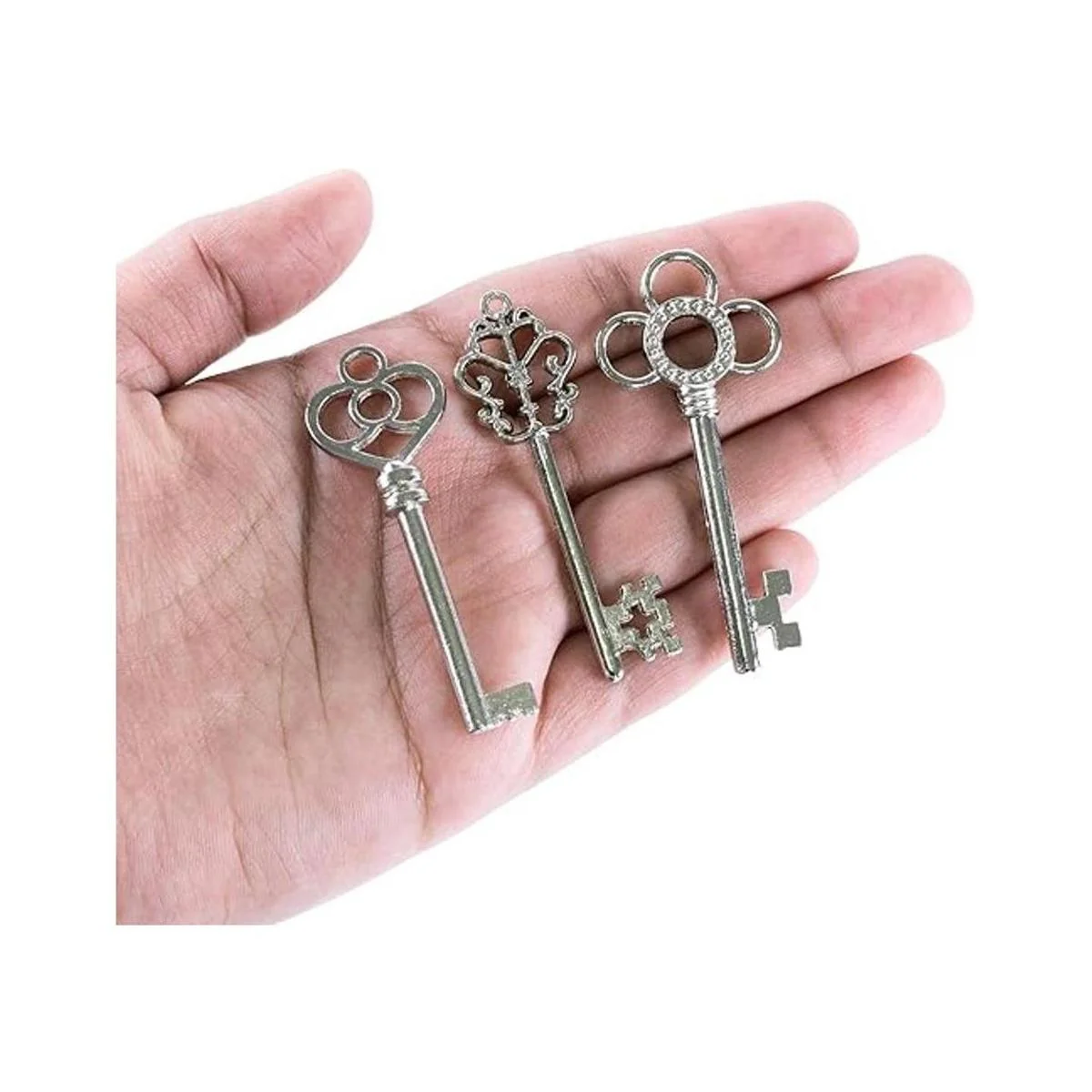 3 diseños diferentes de llaves, para abrir varios castillos, mazmorras y cofres del tesoro. Viene en un paquete de 30 llaves de juguete de plata antigua. Las llaves miden 2.2 in de largo y 0.5 in en el punto más ancho.