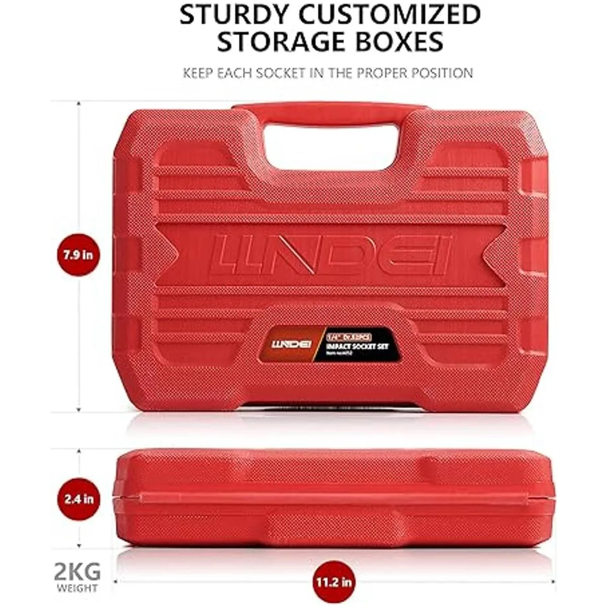 LLNDEI Juego de llaves de impacto de 14 pulgadas, juego de 52 herramientas mecánicas con trinquete y adaptador de 72 dientes, CRV, enchufes métricos y SAE con kit de herramientas de almacenamiento para el hogar, la reparación automotriz y el proyecto de bricolaje