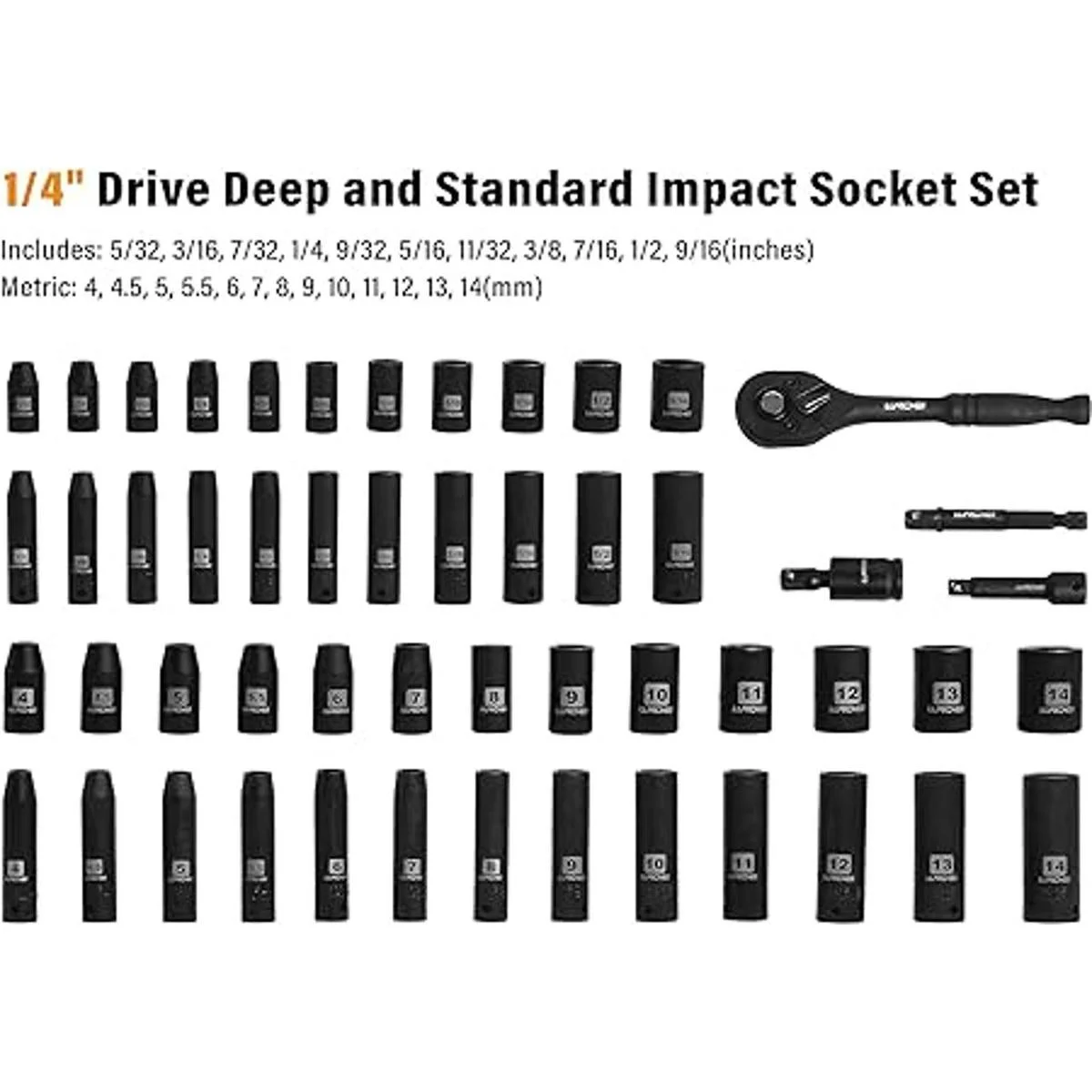 Juego de enchufes SAE/METRI: el juego completo viene con las siguientes piezas: 48 enchufes de 1/4 pulgadas, profundo/poco profundo SAE: 5/32,3/16,7/16,7/32,1/4,9/32,5/16,11/32,3/8,1/2,9/16 pulgadas de profundidad. ep/poco profundo Métrico: 4, 4.5, 5, 5.5, 6, 7, 8, 9, 10, 11, 12, 13, 0.551 in; 1 barra de extensión de impacto de 1/4 pulgadas: 2 pulgadas; 1 junta universal de 1/4 pulgadas; 1 adaptador de 1/4 pulgadas; 1 mango de trinquete de 72 dientes de 1/4 pulgadas; 1 funda de transporte.