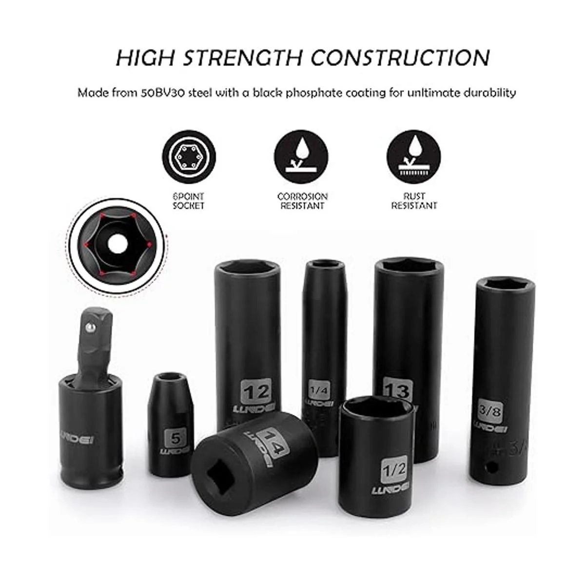 Diseño de 6 puntos: los enchufes LLNDEI agarran los lados planos de los cierres, no las esquinas. El diseño de enchufe hexagonal de 6 puntos evita el redondeo de tuercas y pernos bajo un alto esfuerzo de torsión y tensión de martillado por el uso de llaves de impacto y eléctricas con una fuerte salida.