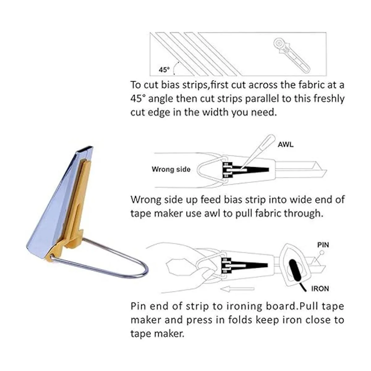 Herramienta de encuadernación para hacer cualquier tela en un acento, borde o borde. Tira de la tela y plancha, se pliega perfectamente, listo para coser o pegar. La cinta de bies se puede utilizar ampliamente en varias artesanías de cuero, parches de sastre, bricolaje y mucho más