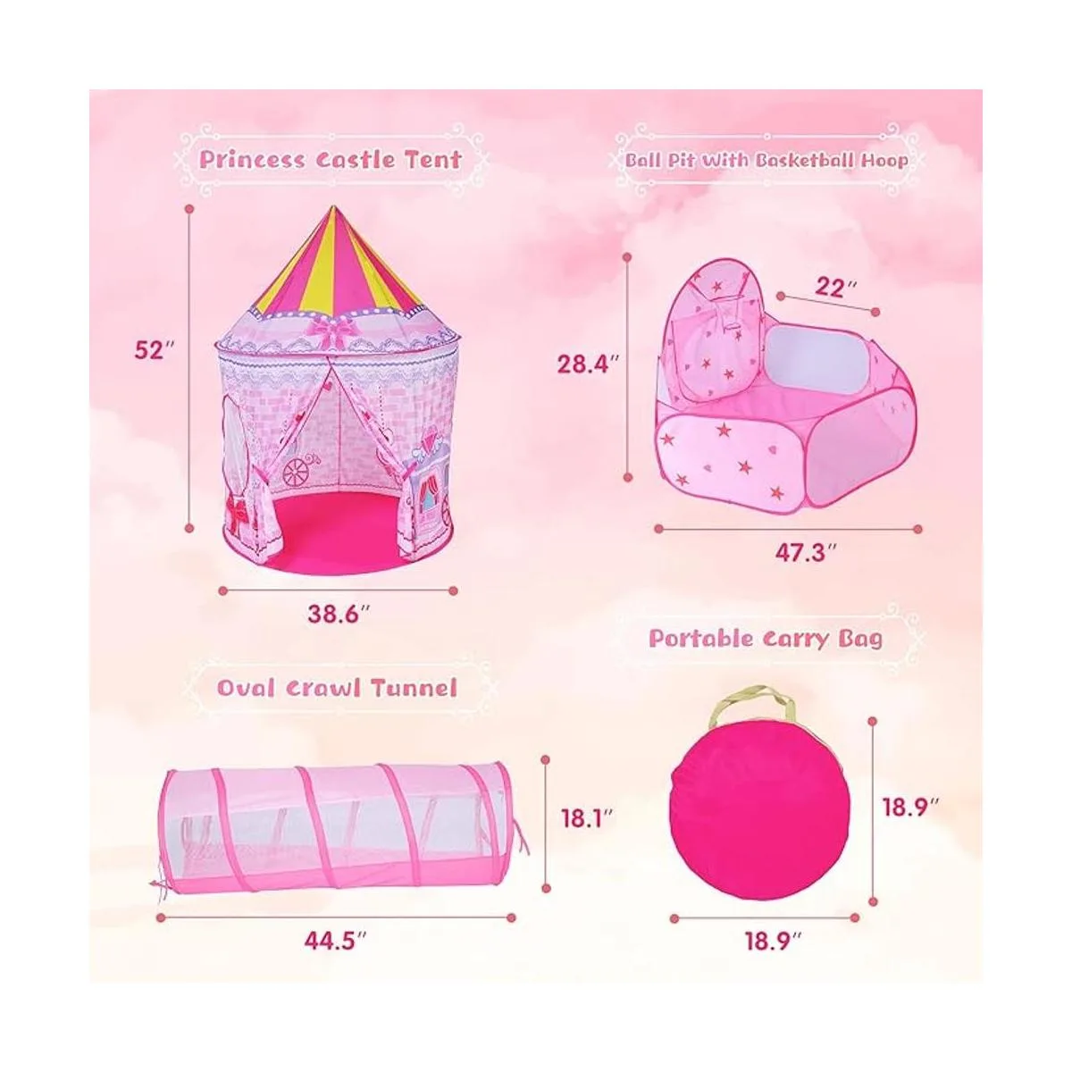 Lojeton Tienda de campaña para niña con diseño de cuento de hadas, tiene túnel de rastreo y piscina de pelotas con aro de baloncesto para niñas pequeñas, juego de interiores y exteriores (3 piezas)