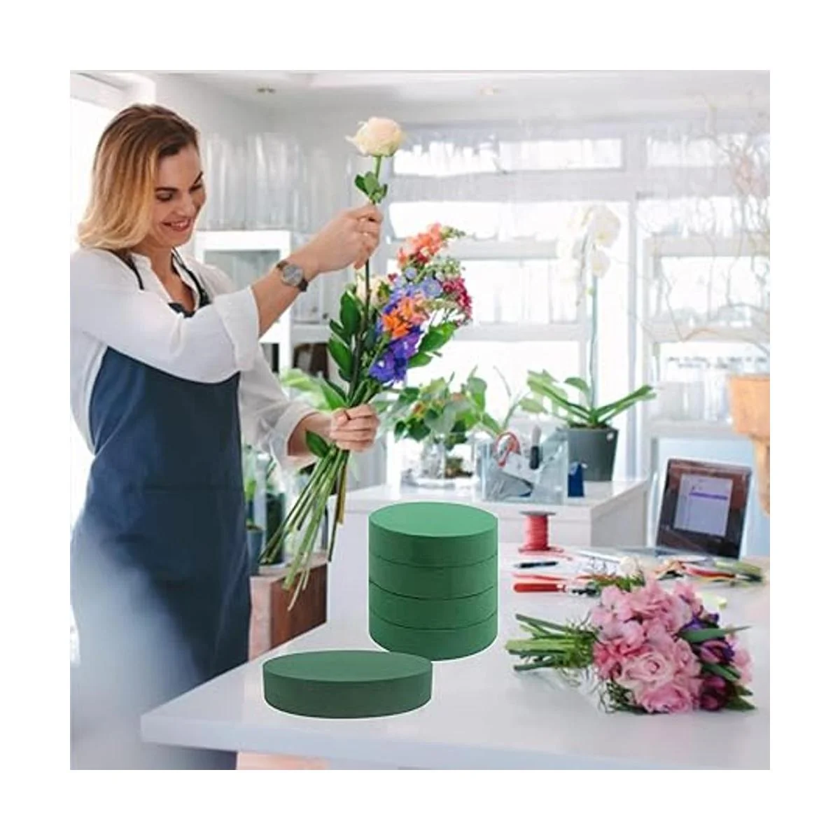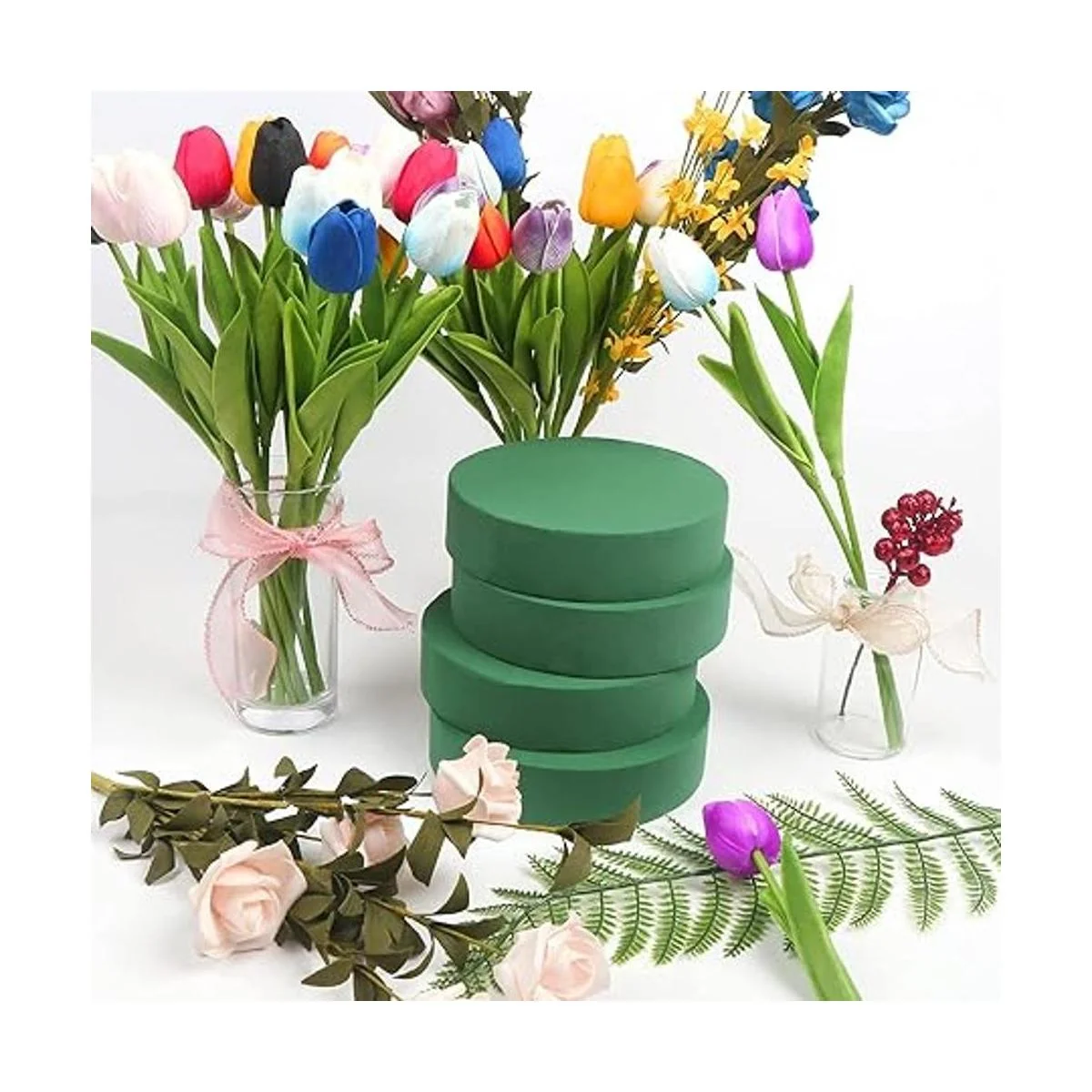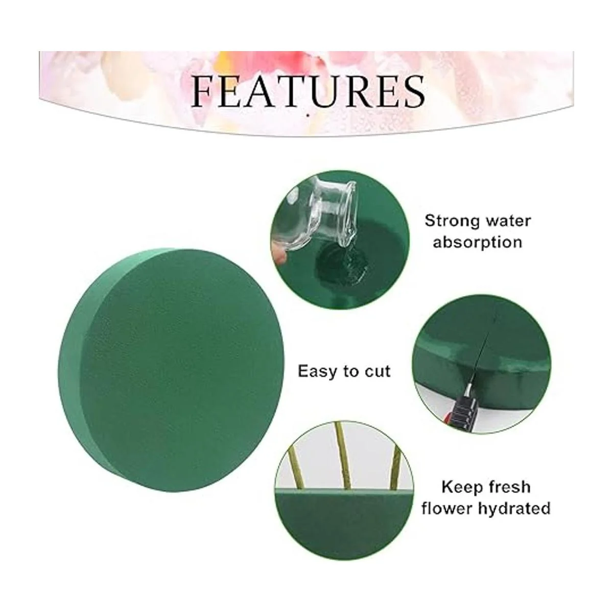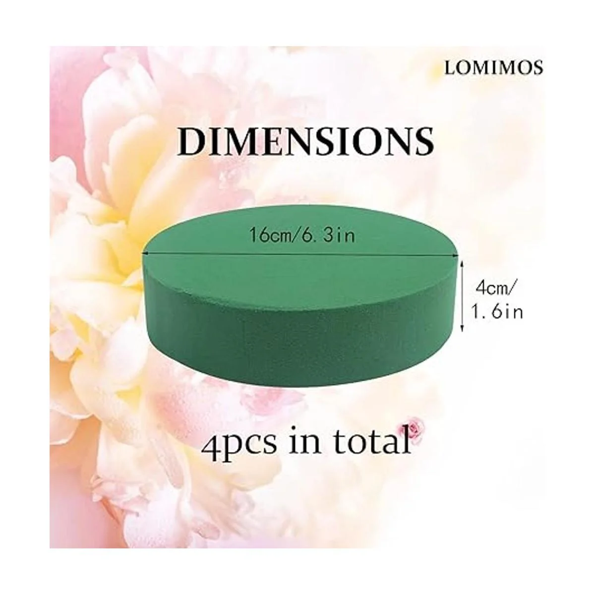 Paquete: 4 bloques de espuma floral incluidos, cada espuma redonda mide 1.57 x 6.30 pulgadas.