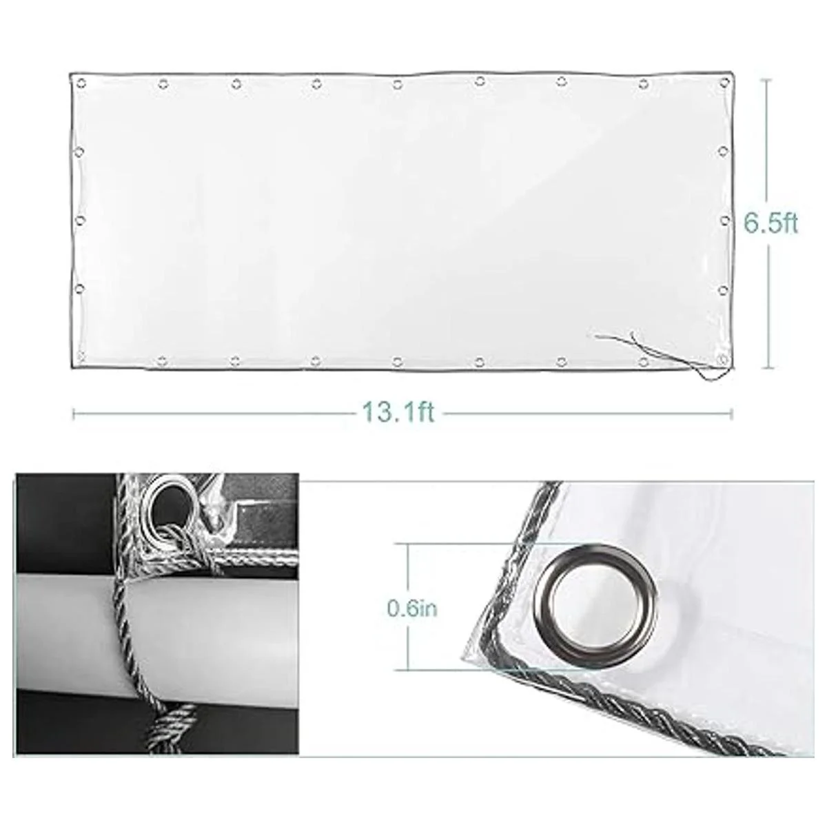 Especificaciones: 0.465 in de grosor. Tamaño del acabado de las lonas: 6 x 13 pies. Ojales de metal resistentes a la corrosión cada 19.7 pulgadas. El diámetro de los ojales es de 0.6 pulgadas. Cuerda reforzada alrededor. Ten en cuenta que el tamaño final será ligeramente más pequeño que el tamaño de corte indicado debido a las arrugas de los bordes.