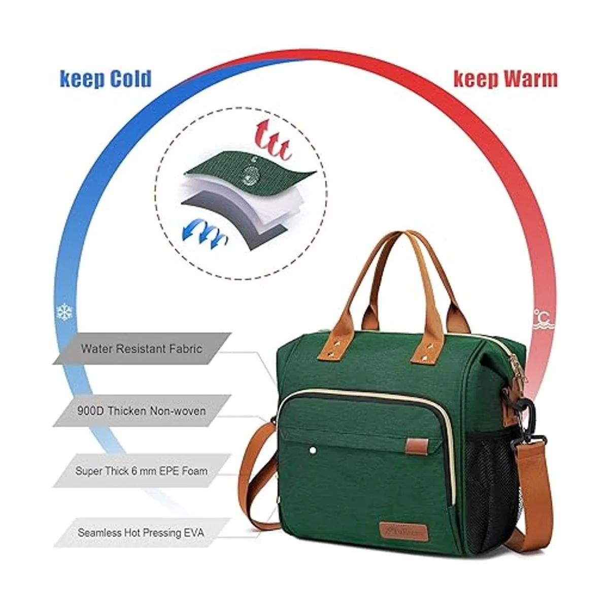 A prueba de fugas y con aislamiento térmico : la lonchera térmica reutilizable está equipada con un forro de poliéster impermeable y ecológico que es suave, a prueba de fugas y fácil de limpiar. Acolchado con espuma de polietileno expandido EPE de 15/64 de pulgada 6 mm y tela exterior de lona impermeable 900d de poliéster y compuesto que mantendrá tu comida fresca o caliente cuando estés enfrentando el ajetreo diario