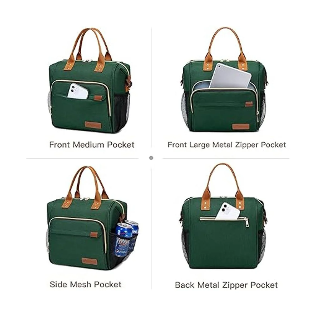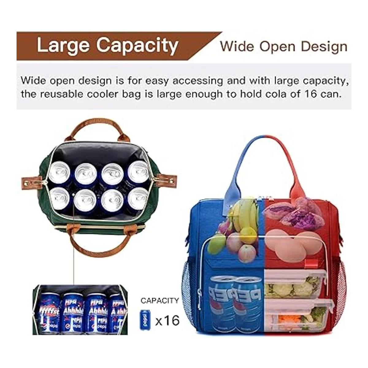 Gran capacidad : las dimensiones son de 10.25 x 6.7 x 11.87 pulgadas 25.4 x 17.02 x 20.32 cm largo x ancho x alto. El compartimento principal es de gran capacidad y la lonchera puede contener 16 latas de bebida de 11.16 fl oz 330 ml. Puede guardar todos tus alimentos como sándwich, ensalada, aperitivos, bebidas y frutas para todo el día