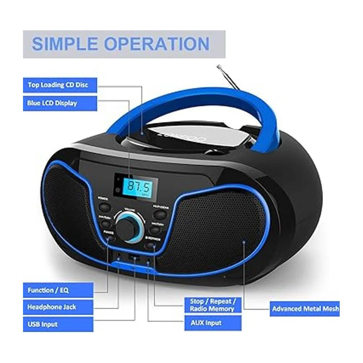 Reproductor de CD portátil de carga superior El Boombox portátil LONPOO soporta la mayoría de los formatos como CD, CDR, CDRW, pantalla LED de pista de CD.