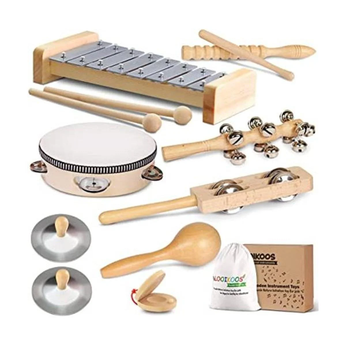 LOOIKOOS Instrumentos musicales para niños pequeños, juego musical ecológico para niños preescolares, instrumentos de percusión de madera natural, juguetes musicales para niños y niñas con bolsa de almacenamiento