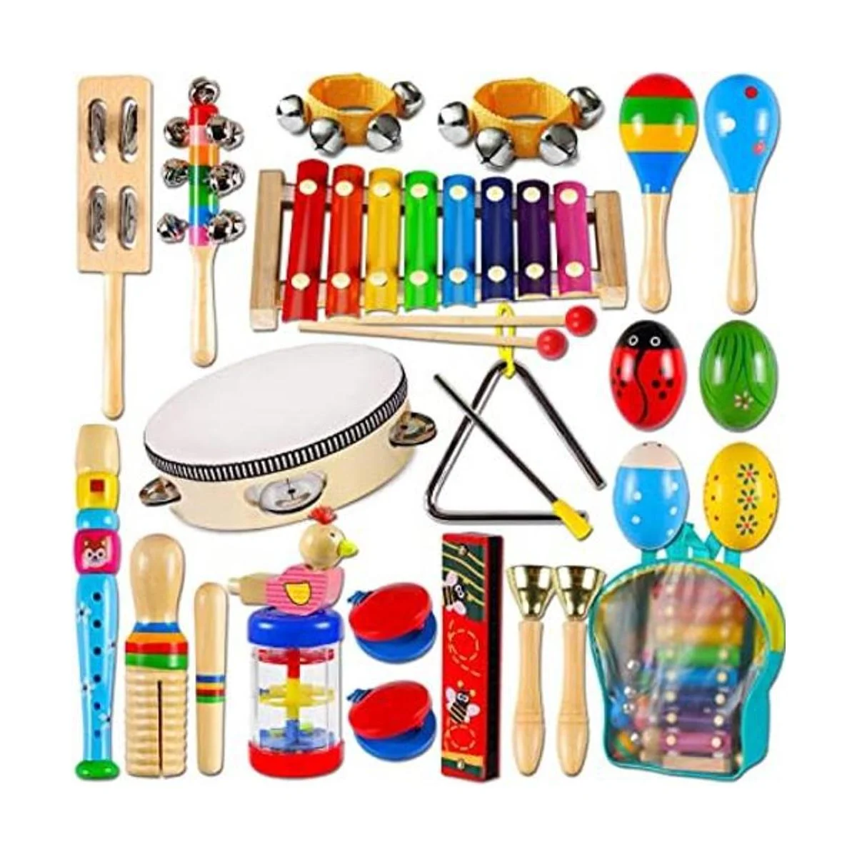 22 instrumentos musicales para niños : Instrumentos musicales para niños LOOIKOOS incluyendo 1 xilófono, 1 armónica, 1 triángulo con golpeador, 2 maracas, 4 huevos agitadores, 2 castañuelas, 1 pandereta, 2 trineo, 1 campana arcoíris, 1 silbatos de pájaros, 1 columna arcoíris, 1 madera 1 velocidad. aker, 1 palo de cascabel, expone a tu mini músico a diferentes tonos, volumen y ritmo, lo que es atractivo para los niños. Y vienen con una bonita bolsa. Juguetes preescolares perfectos para regalo de cumpleaños o Navidad de los niños.