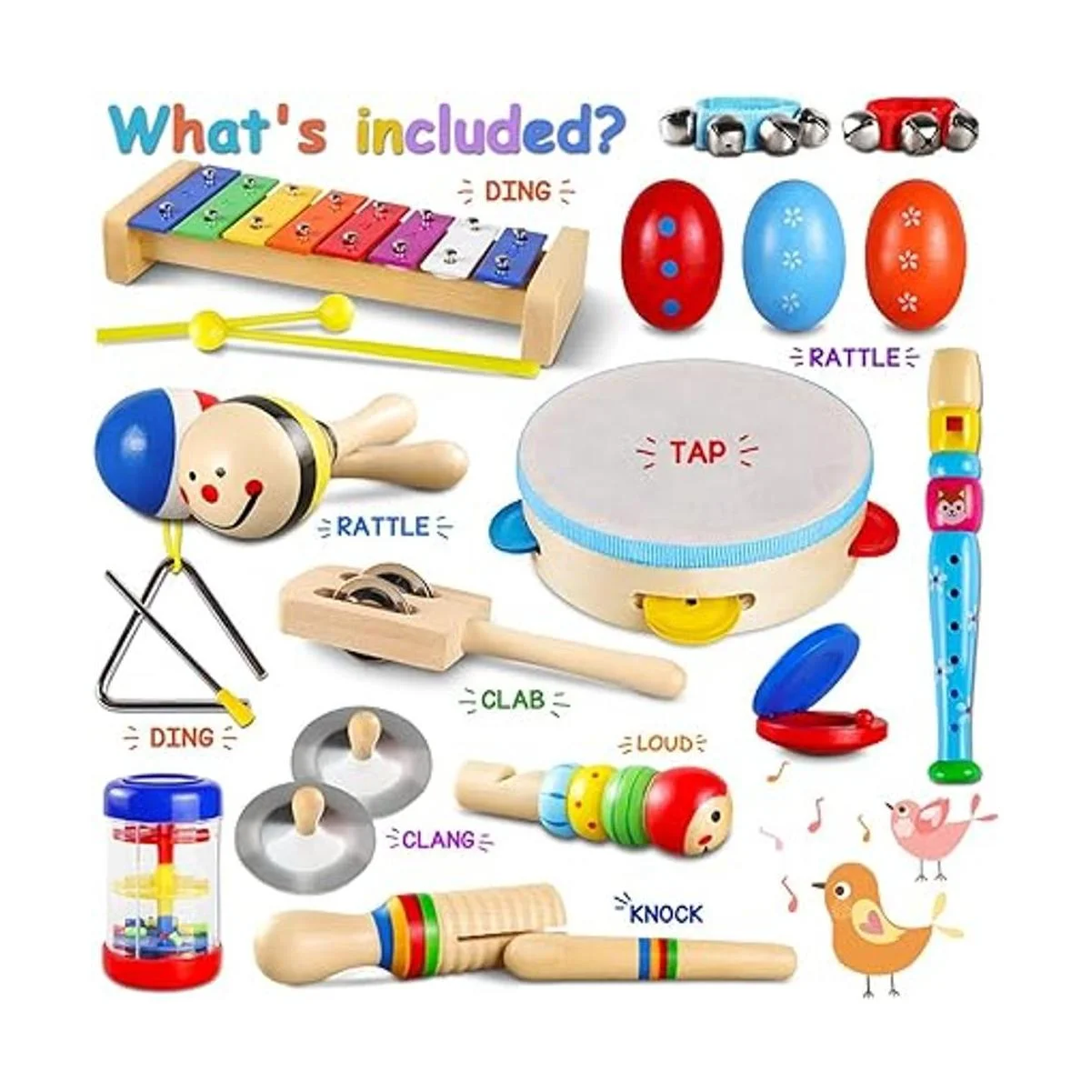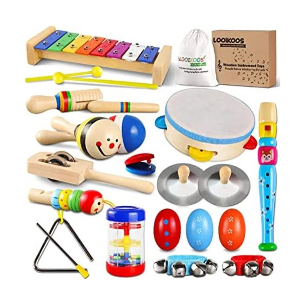 LOOIKOOS Juego de instrumentos musicales de madera para niños pequeños, juguetes musicales educativos para niños y niñas con bolsa de almacenamiento