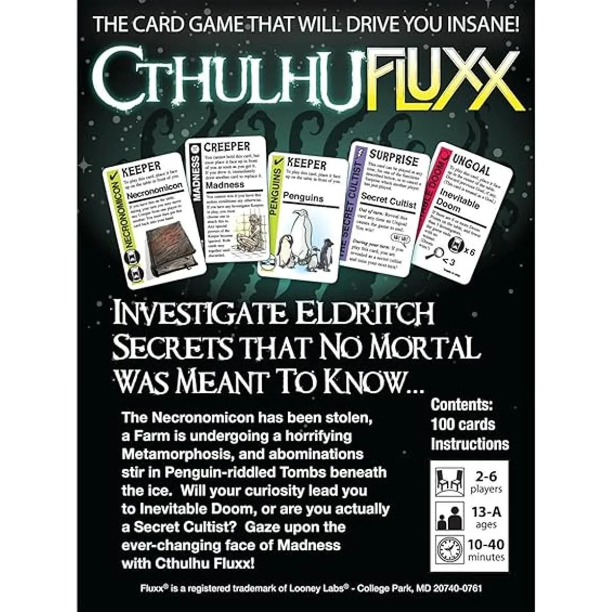 Juegos divertidos: esta versión de Fluxx se basa en la serie Cthulhu establecida por HP Lovecraft. Explora el misterio oscuro y horrible de lo desconocido mientras luchas contra la locura y los cultos diabólicos. Investiga secretos de Eldritch que ningún mortal estaba destinado a saber