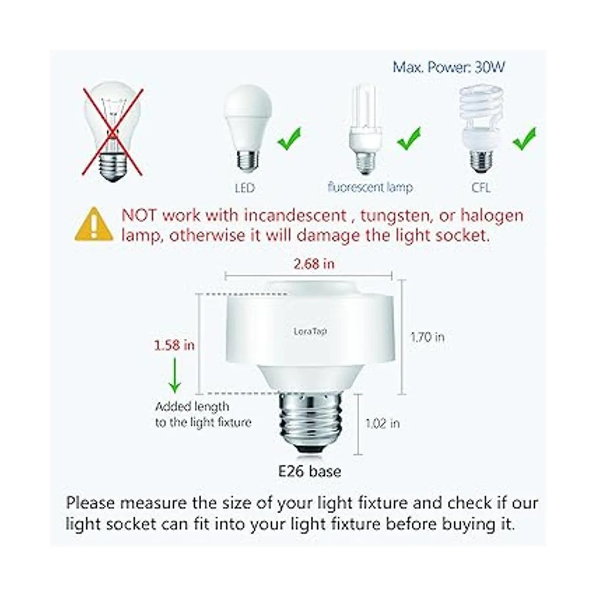 Funciona con la mayoría de bombillas E26, incluyendo bombilla LED, bombilla inteligente, bombilla CFL, bombilla fluorescente, bombilla de maíz, etc., pero no bombilla incandescente, bombilla halógena o bombilla de tungsteno. Añade 1.58 pulgadas extra a la altura de la bombilla. Funciona con 100 120 V CA, carga máxima de 2.5 amperios, potencia máxima de 30 W, resistente al calor 248 /248.0 F, dimensiones del casquillo de la bombilla diámetro x altura: 2.68 x 2.83 pulgadas